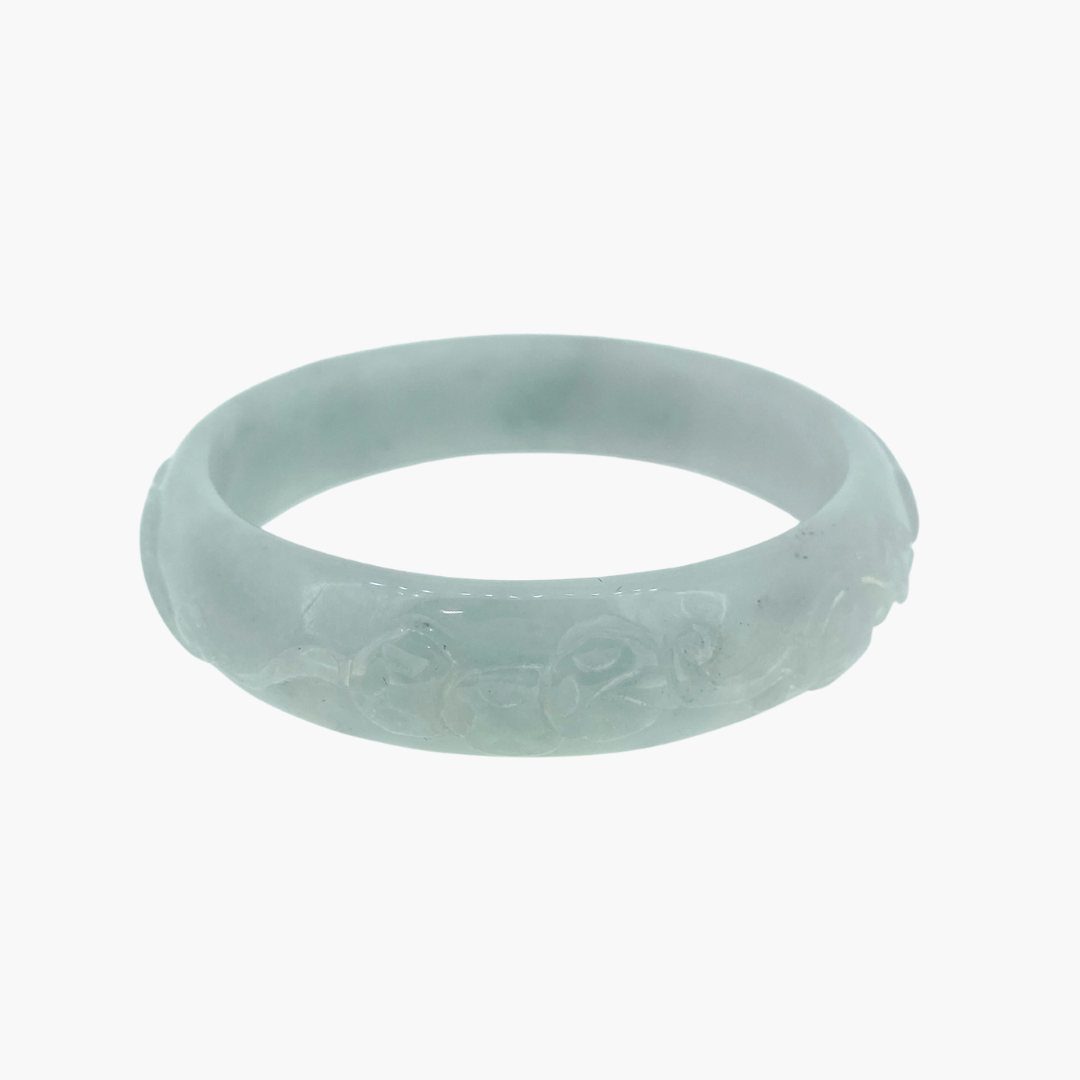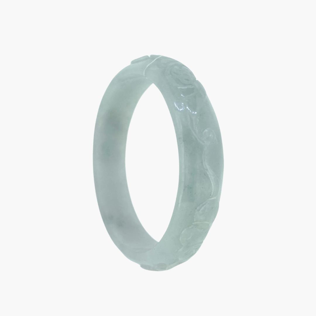 This pale jade bangle features delicate hand-carved details that add texture, meaning, and artistry to its soft, muted tone. The gentle colour enhances the intricacy of the carvings, creating a piece that feels both traditional and refined. A beautiful choice for those who appreciate craftsmanship and subtle elegance.