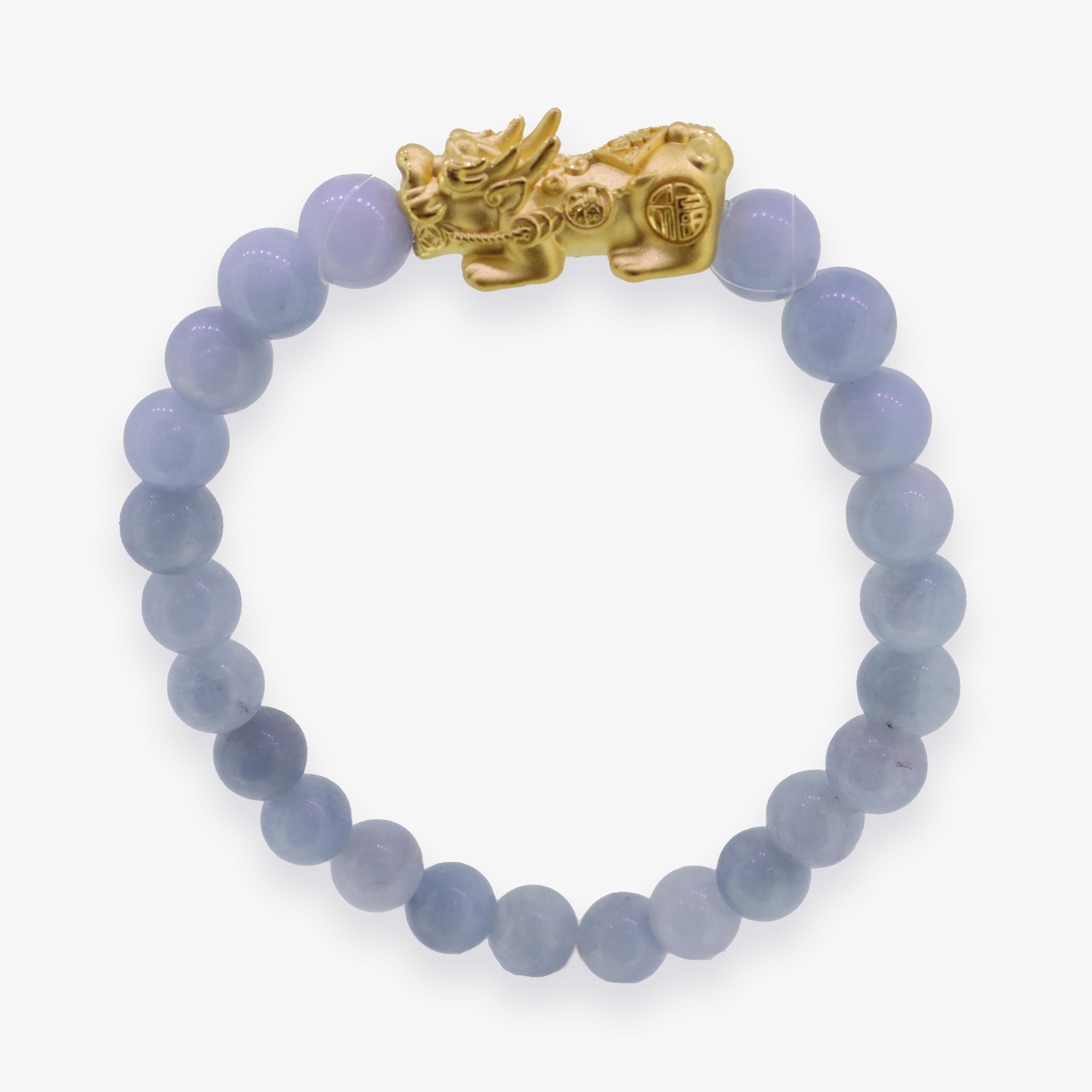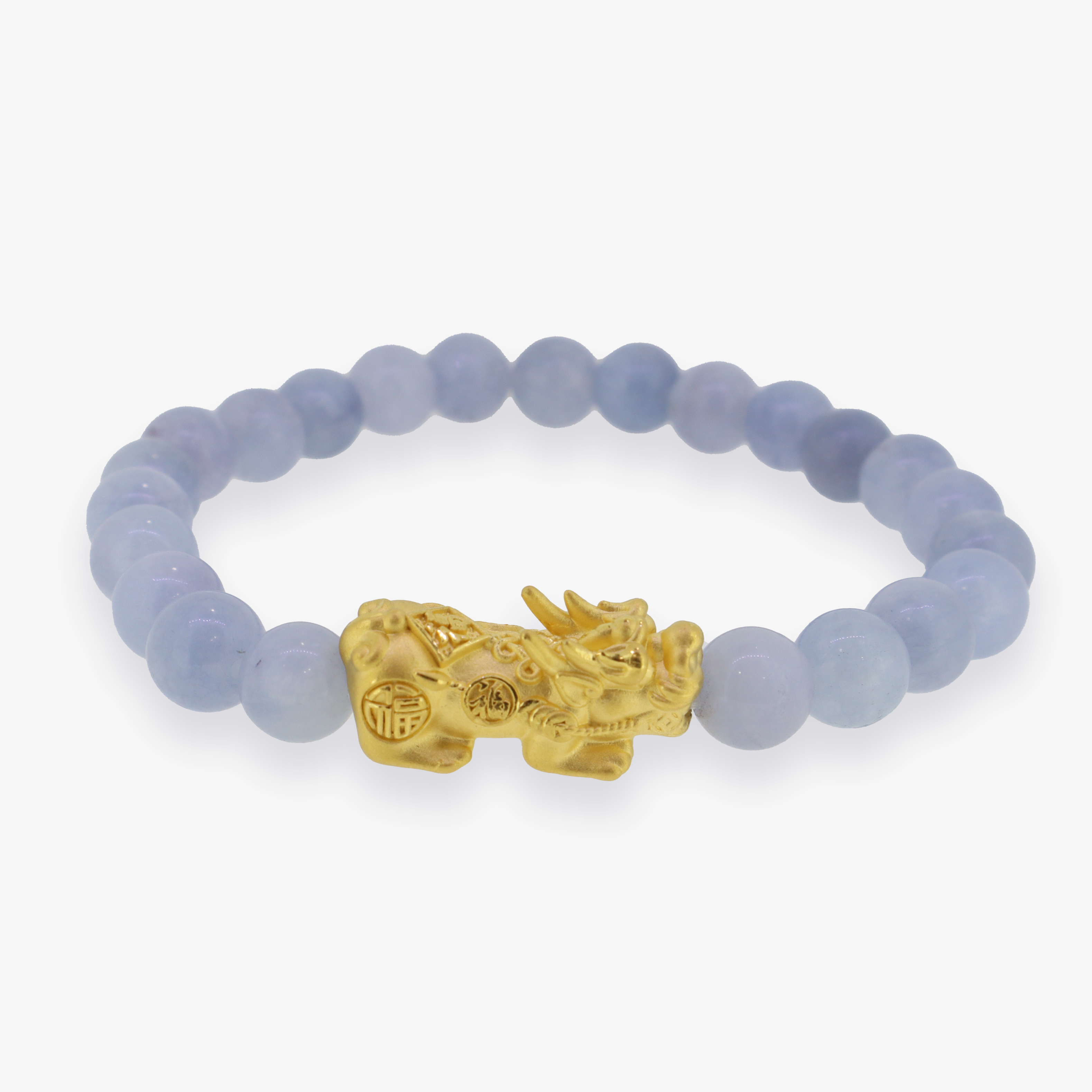 The 24K Yellow Gold Pixiu Aquamarine Bracelet harmonizes opulent 24K gold with the auspicious Pixiu symbol, revered for attracting wealth. Crafted with finesse, this design is adorned with aquamarine, a gemstone symbolising serenity, clarity, and emotional balance, adding a touch of sophistication and grace to the bracelet's design.