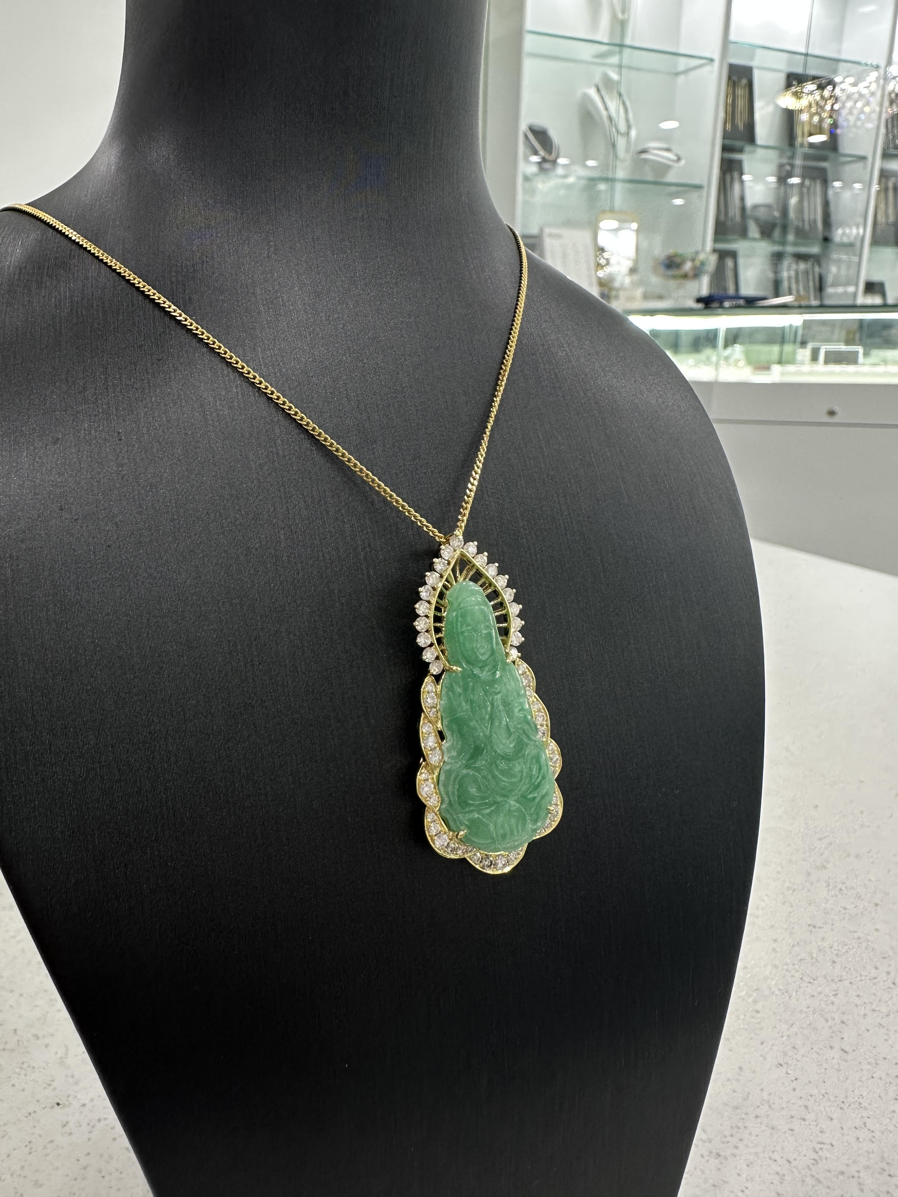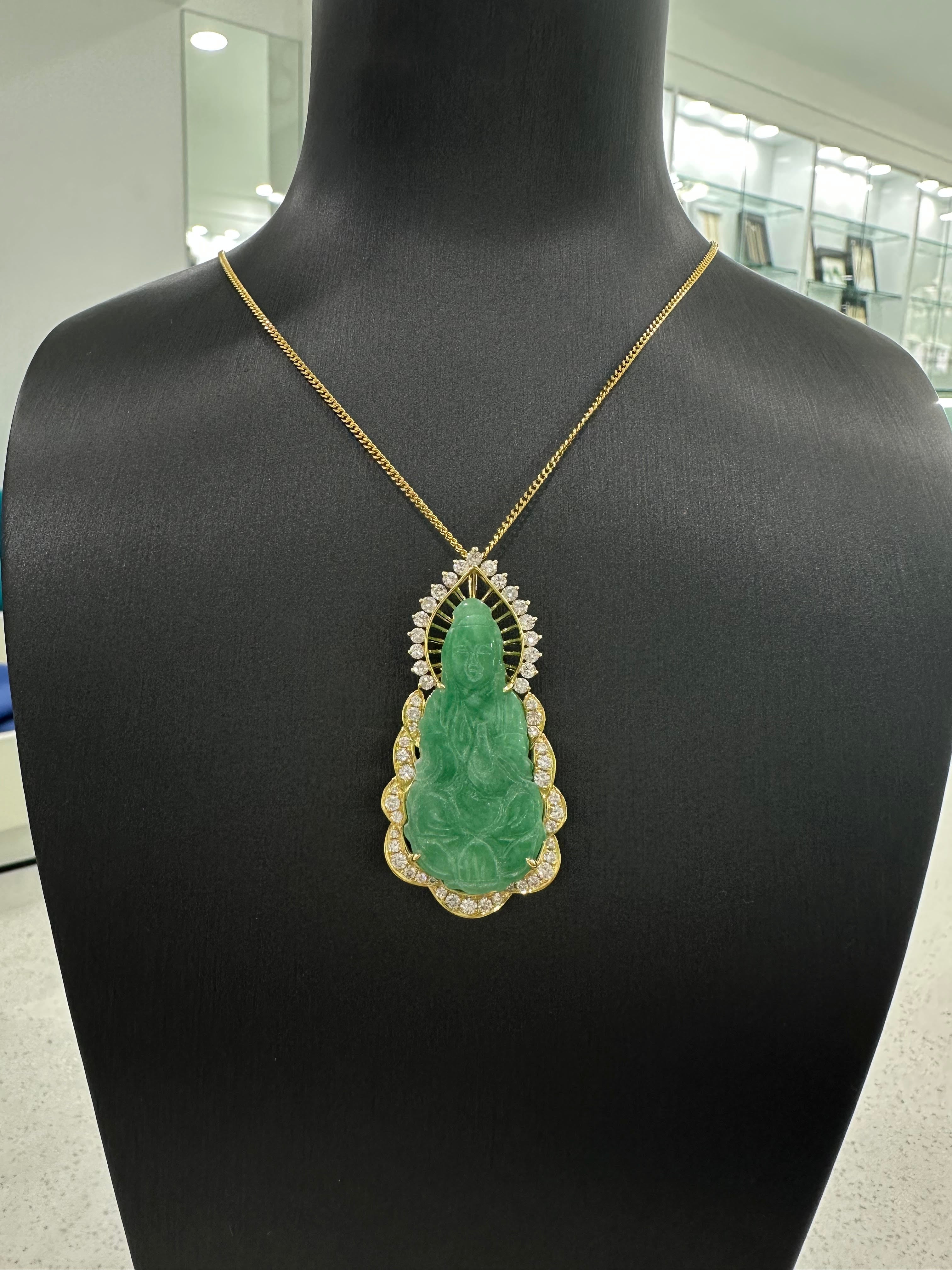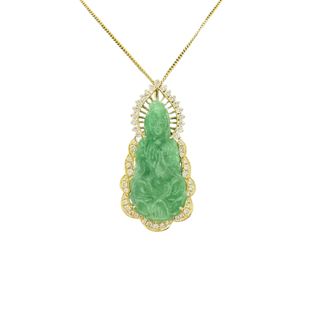 This graceful Buddha pendant is timeless elegance. Crafted from 18 carat yellow gold, its luster is enhanced by 0.938ct of glittering diamonds and Burmese jadeite to craft a piece of fine jewelry with a divine touch.