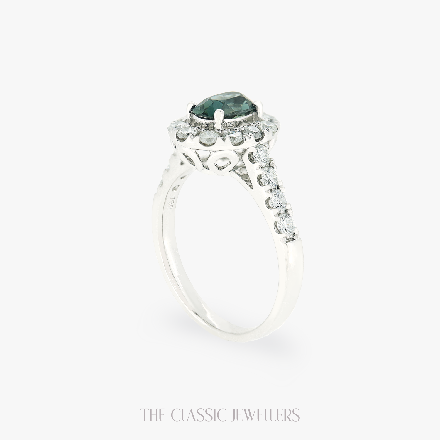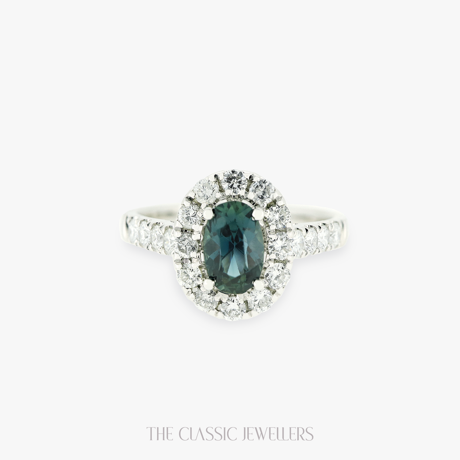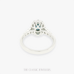 Made with high quality 18K White Gold, our Illara ring features a beautiful oval cut natural deep green parti sapphire, accented by twenty round natural diamonds around the sapphire and on the shoulders.