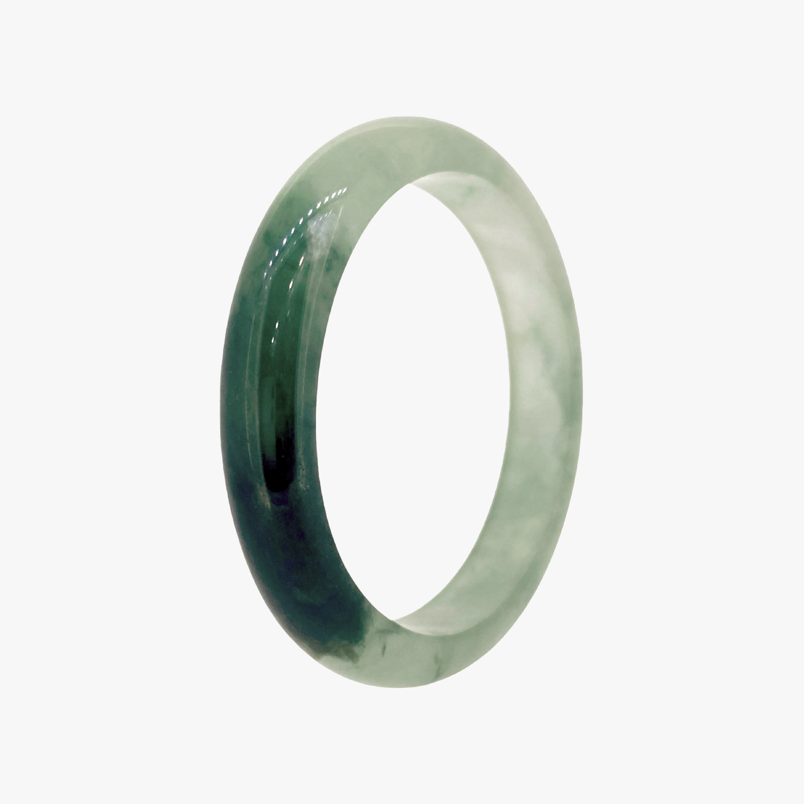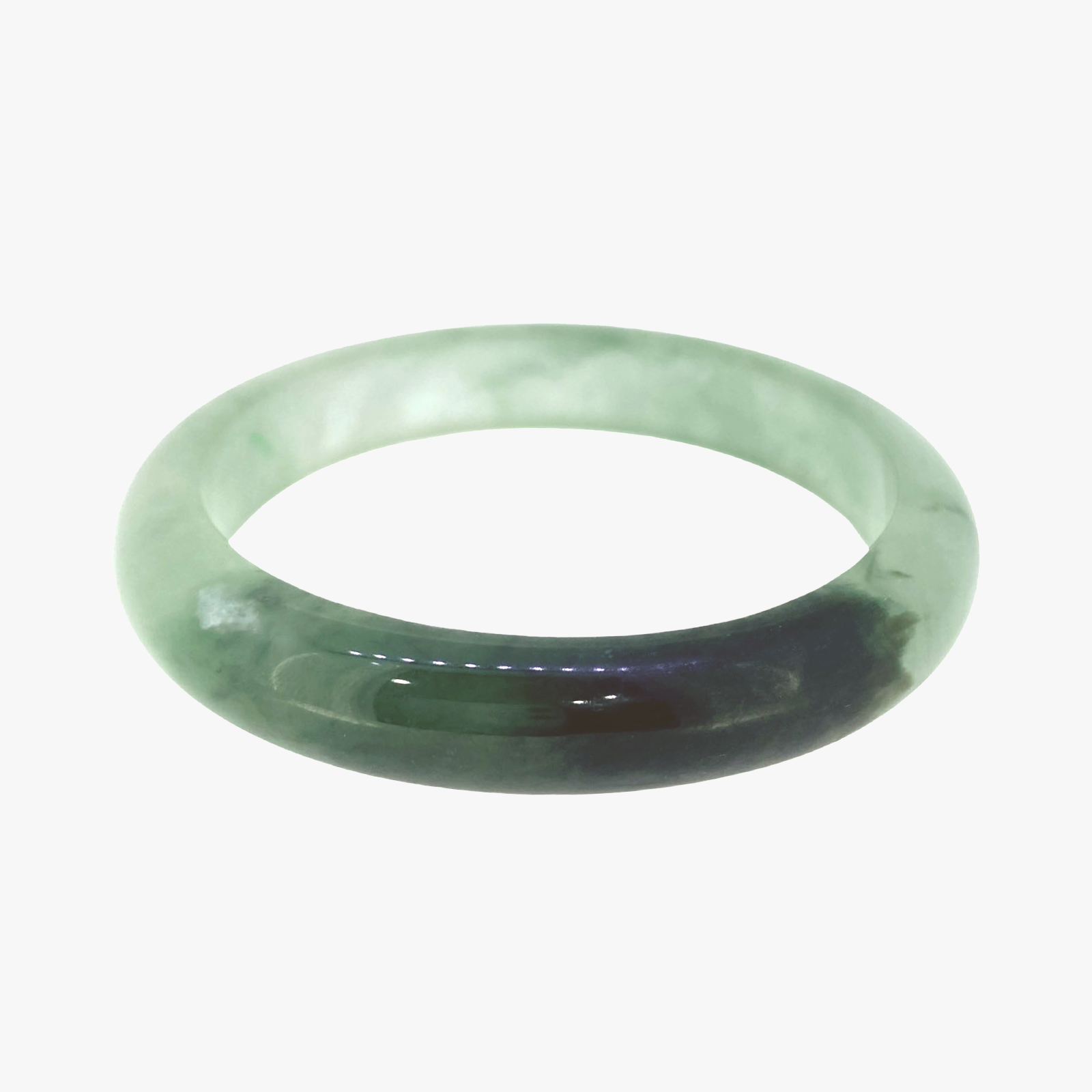 This unique Burmese jade bangle features a light white-green marbled jade band with a magnificent dark green cloud patch - similar to an inks drop in water. The bangle can be worn as a decorative accessory or as a symbol of good luck and prosperity, and can on special occasions or as everyday jewellery.