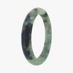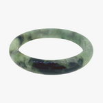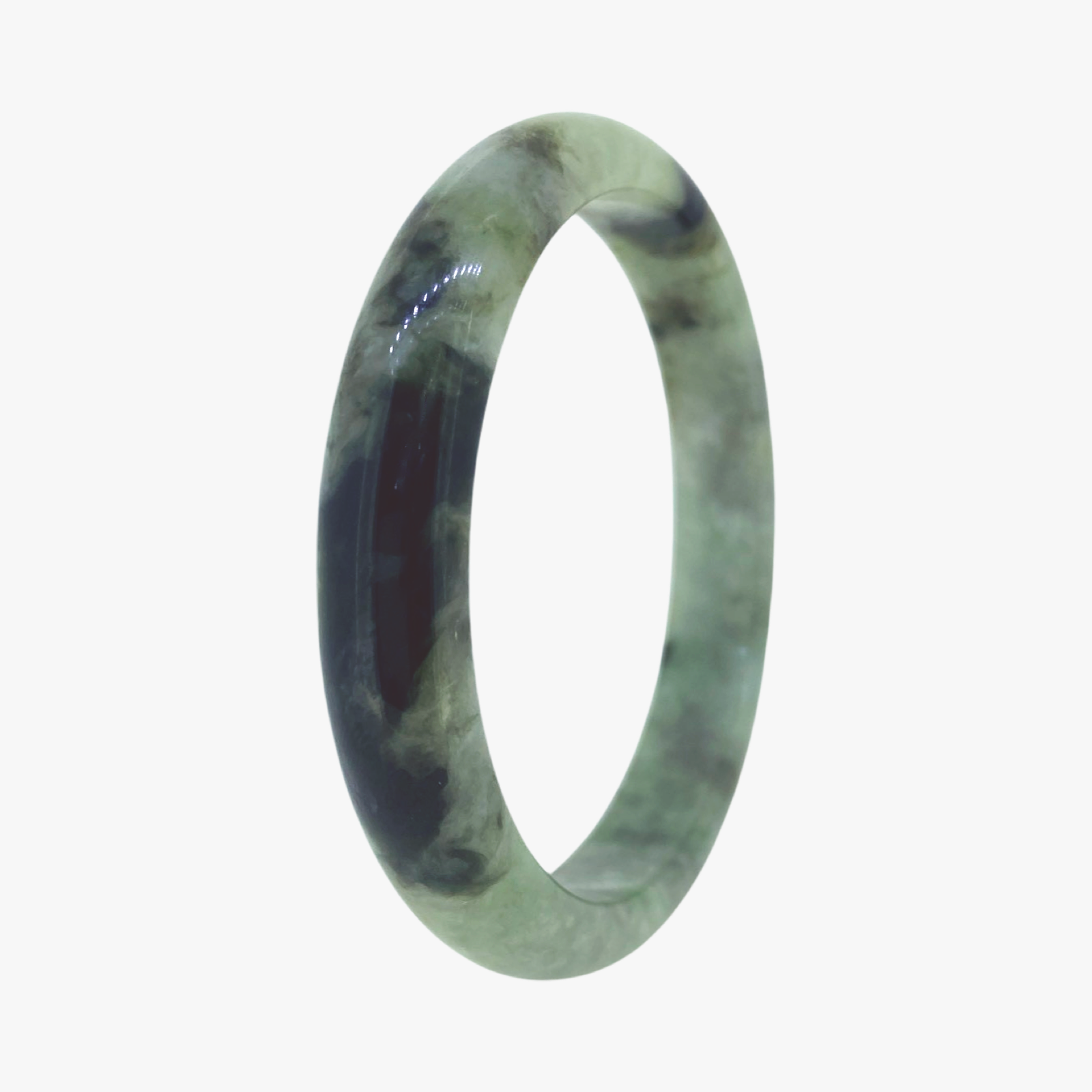 This light grey-green Burmese jade bangle features a dark blue-green cloud colouring, with varying black and white splashes marbled throughout the jade band. The bangle can be worn as a decorative accessory or as a symbol of good luck and prosperity, and worn on special occasions or as everyday jewellery.