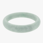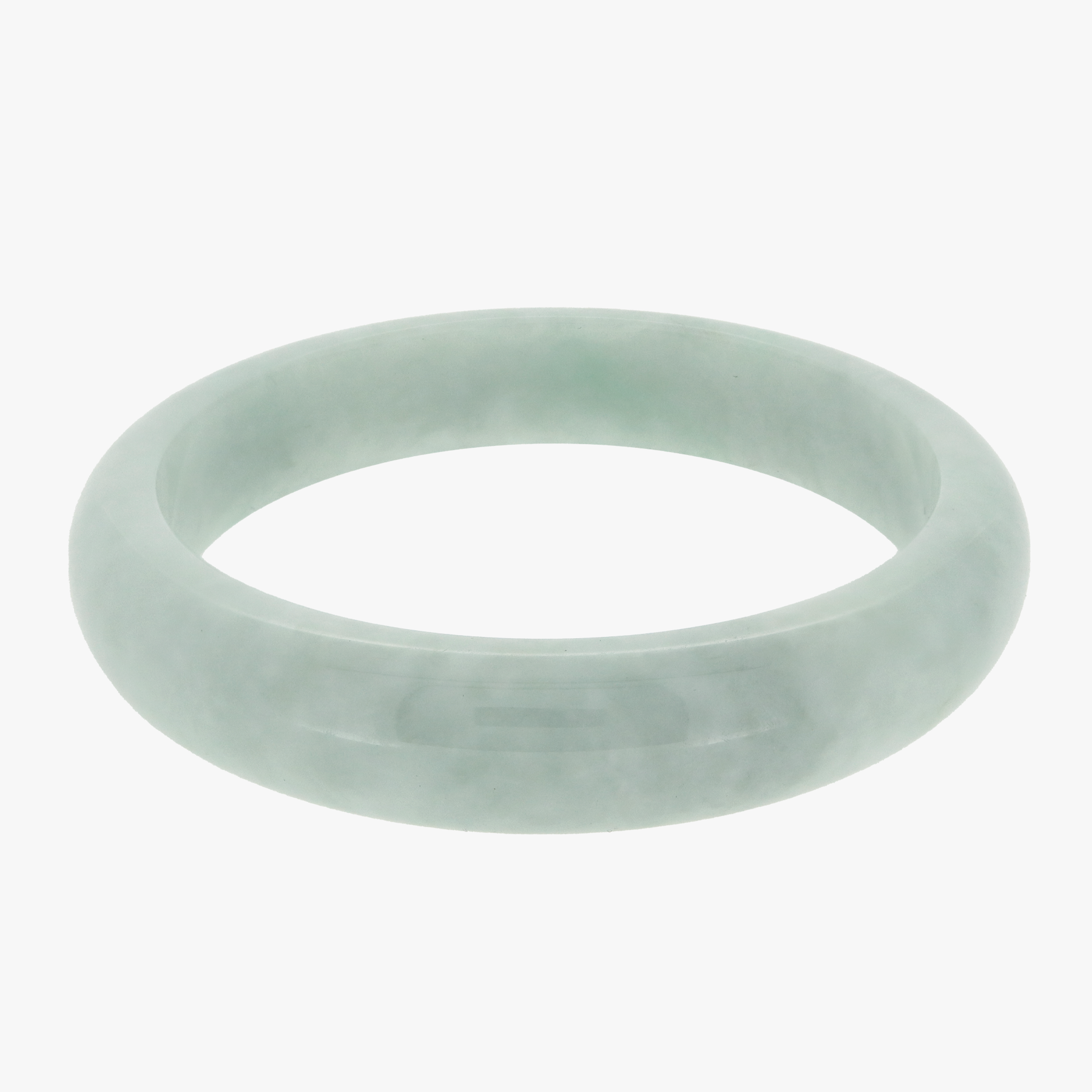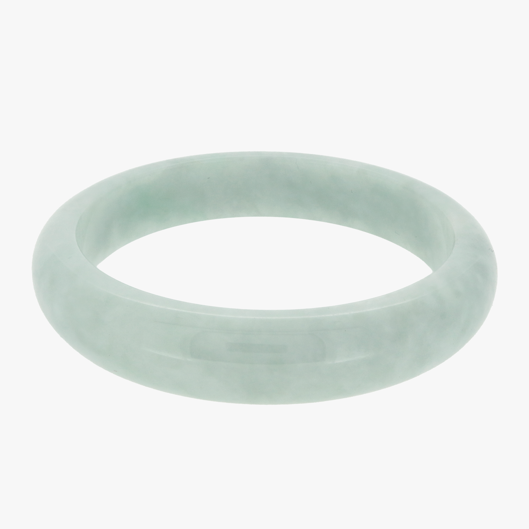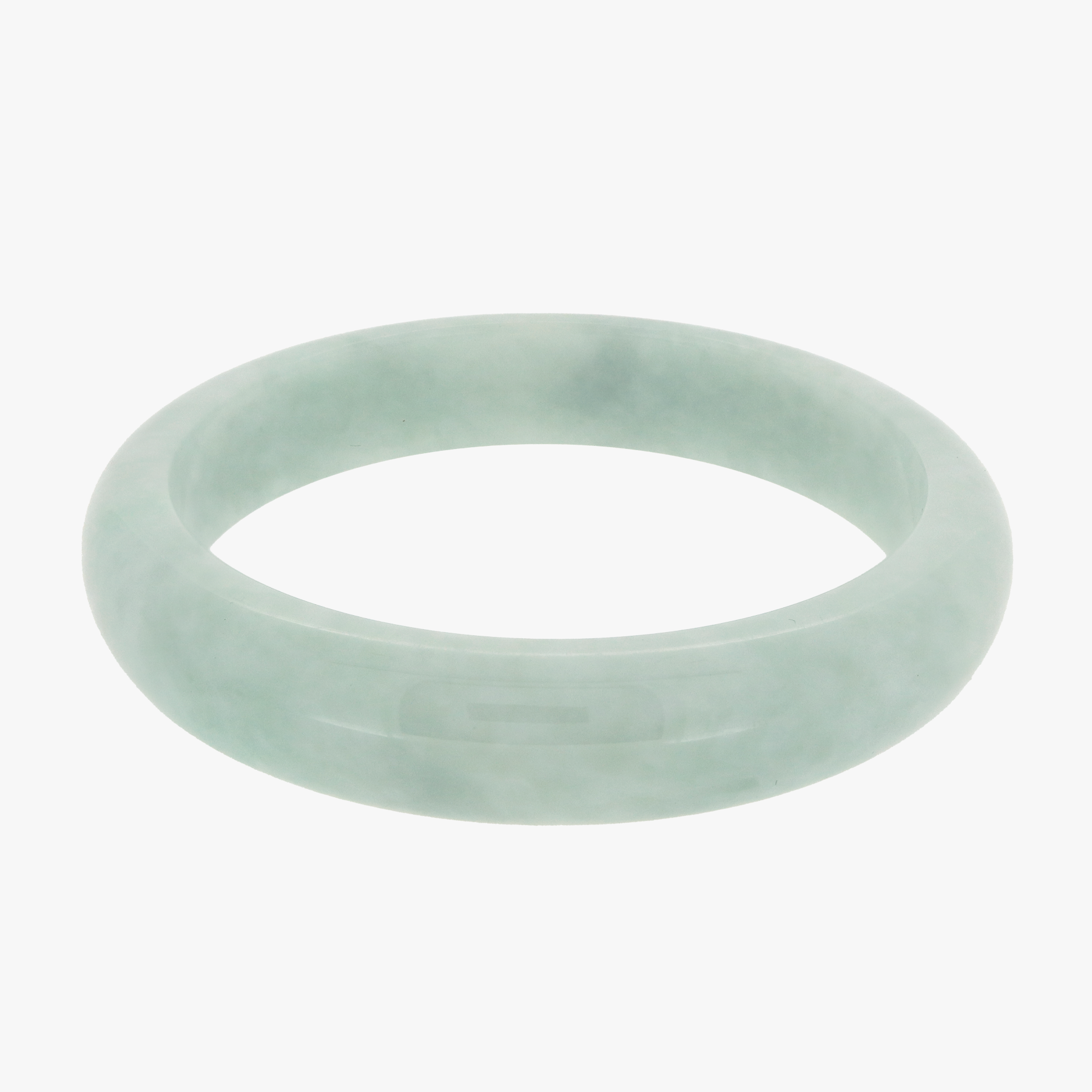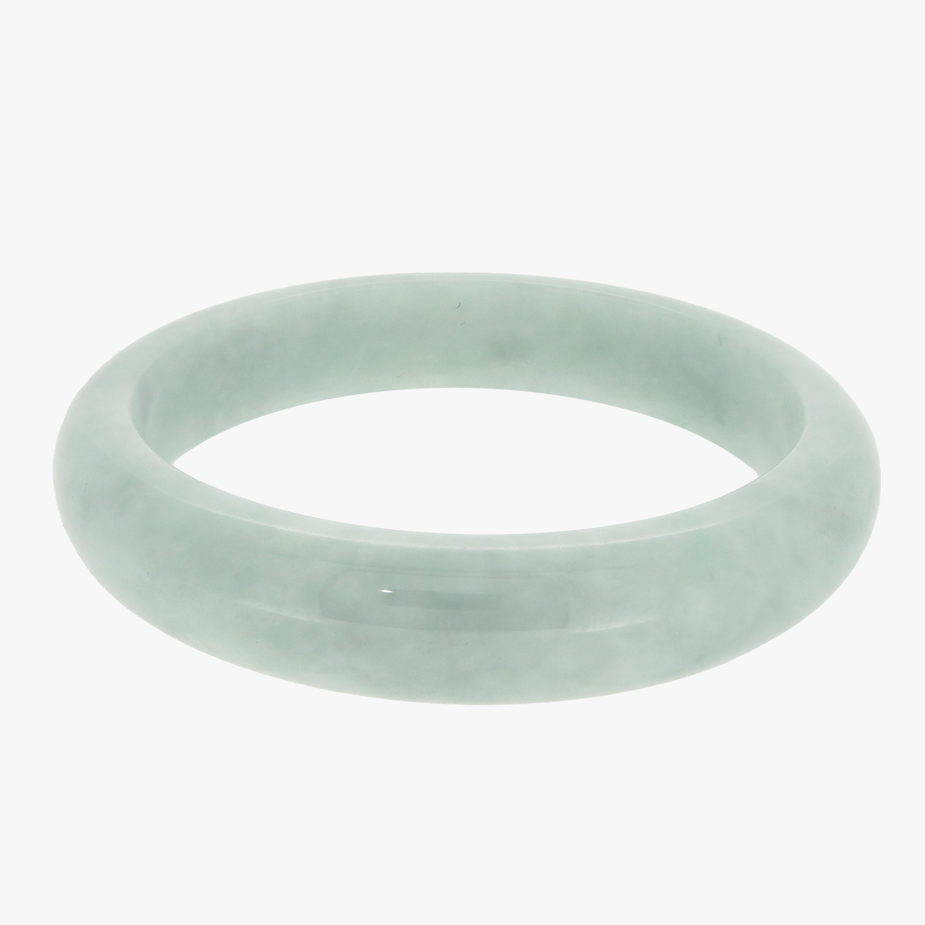 From our Grade A jade series featuring high quality, untreated natural Burmese Jade comes our Kouri Jade Bangle. Made of the highest grade of jade, this half round bangle is an even light white-green colour with mottled white patches within and produces a clear sound when tapped.