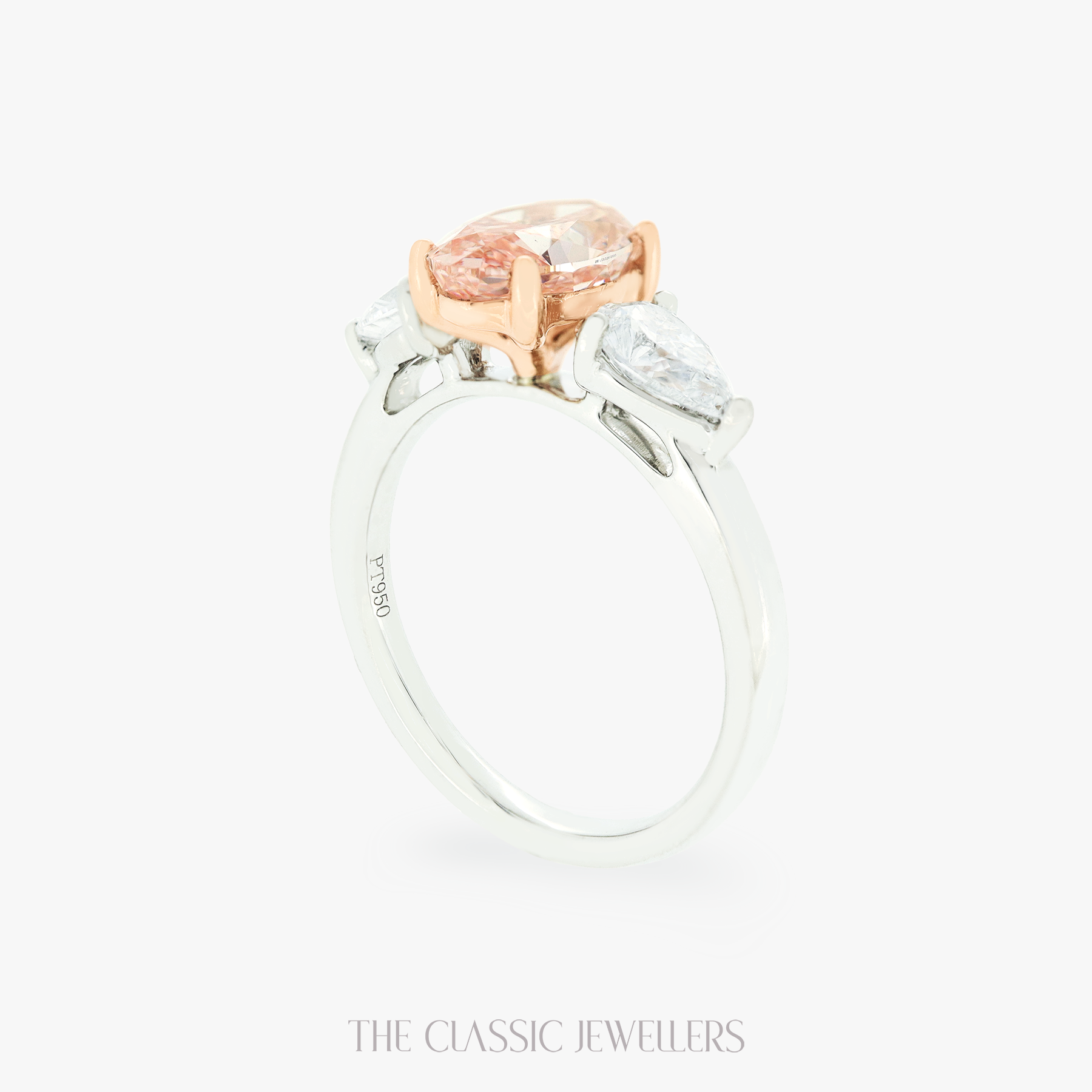Our stunning Rosabelle Platinum trilogy ring features a sparkling oval cut lab pink diamond accompanied by two lab pear cut diamonds. 2 Tones Trilogy Ring Pink Diamond