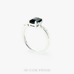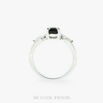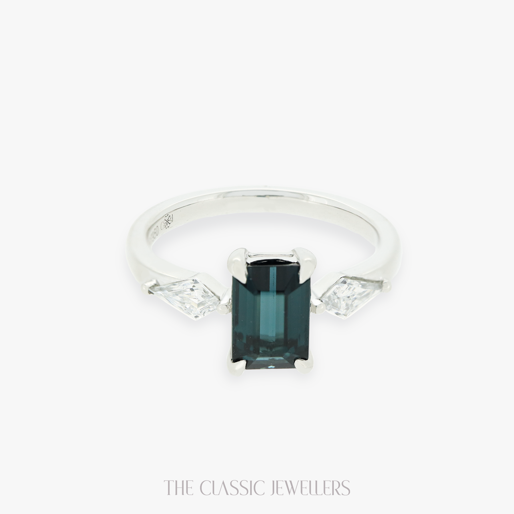 This Miralune Platinum trilogy ring features a stunning 1ct emerald cut Natural Tourmaline, accompanied by two lab kite diamonds.