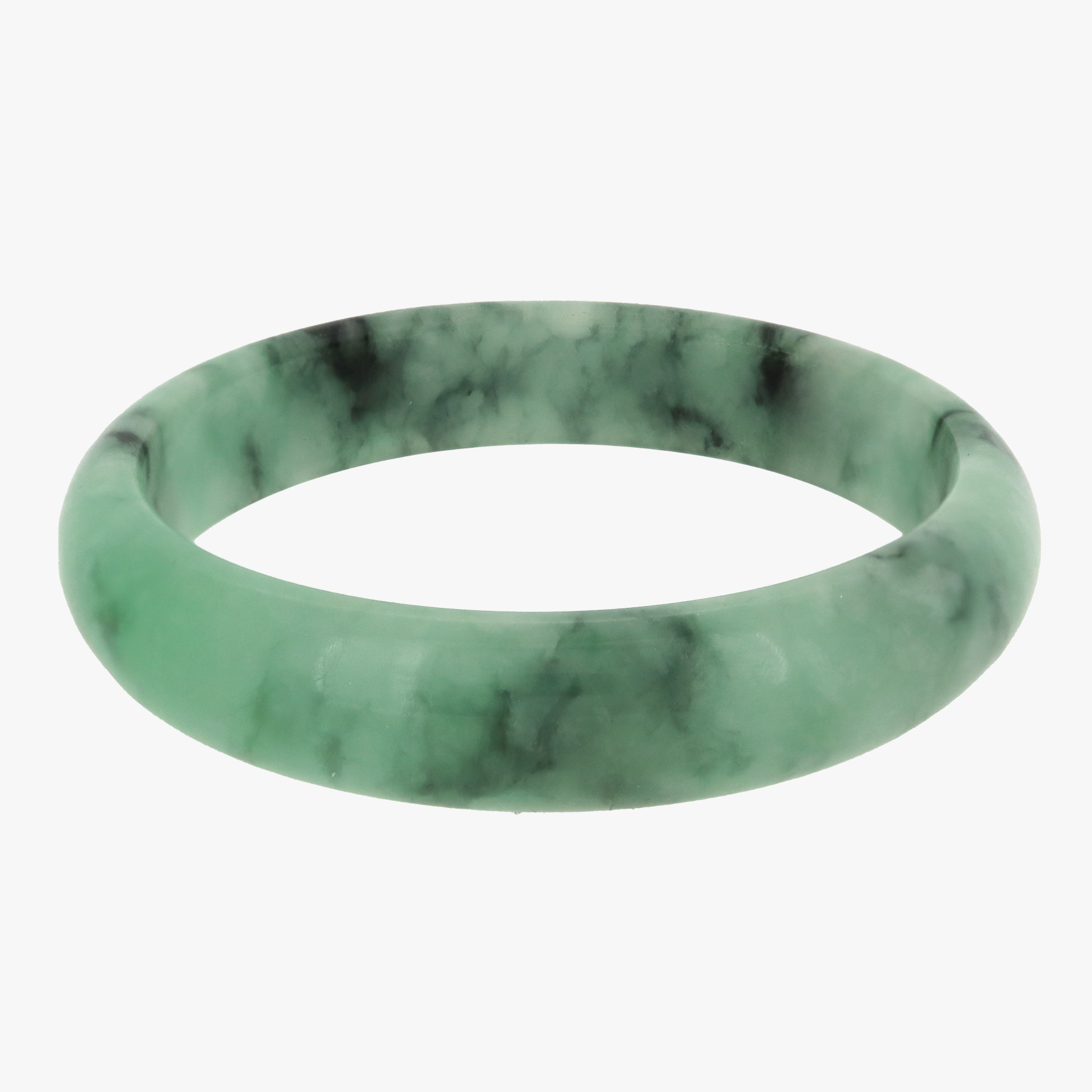 From our Grade A jade series featuring high quality, untreated natural Burmese Jade comes our Gomu Jade Bangle. The bangle is a smaller, light green bangle with clouds of light grey and dark green flecks.