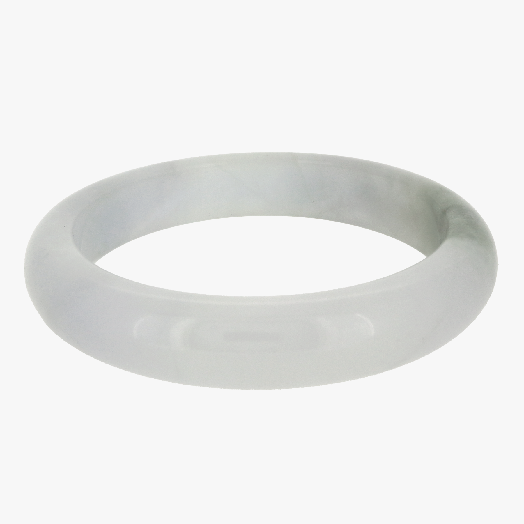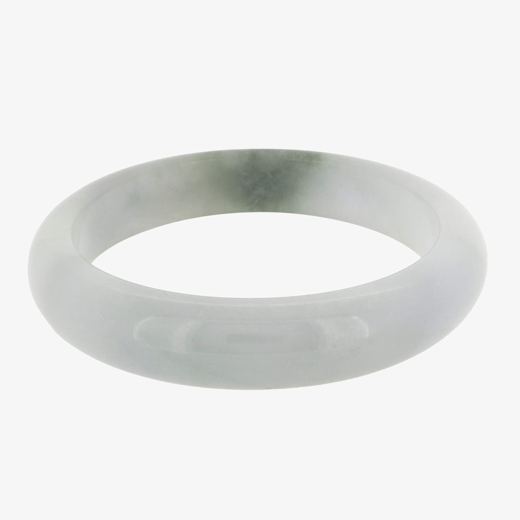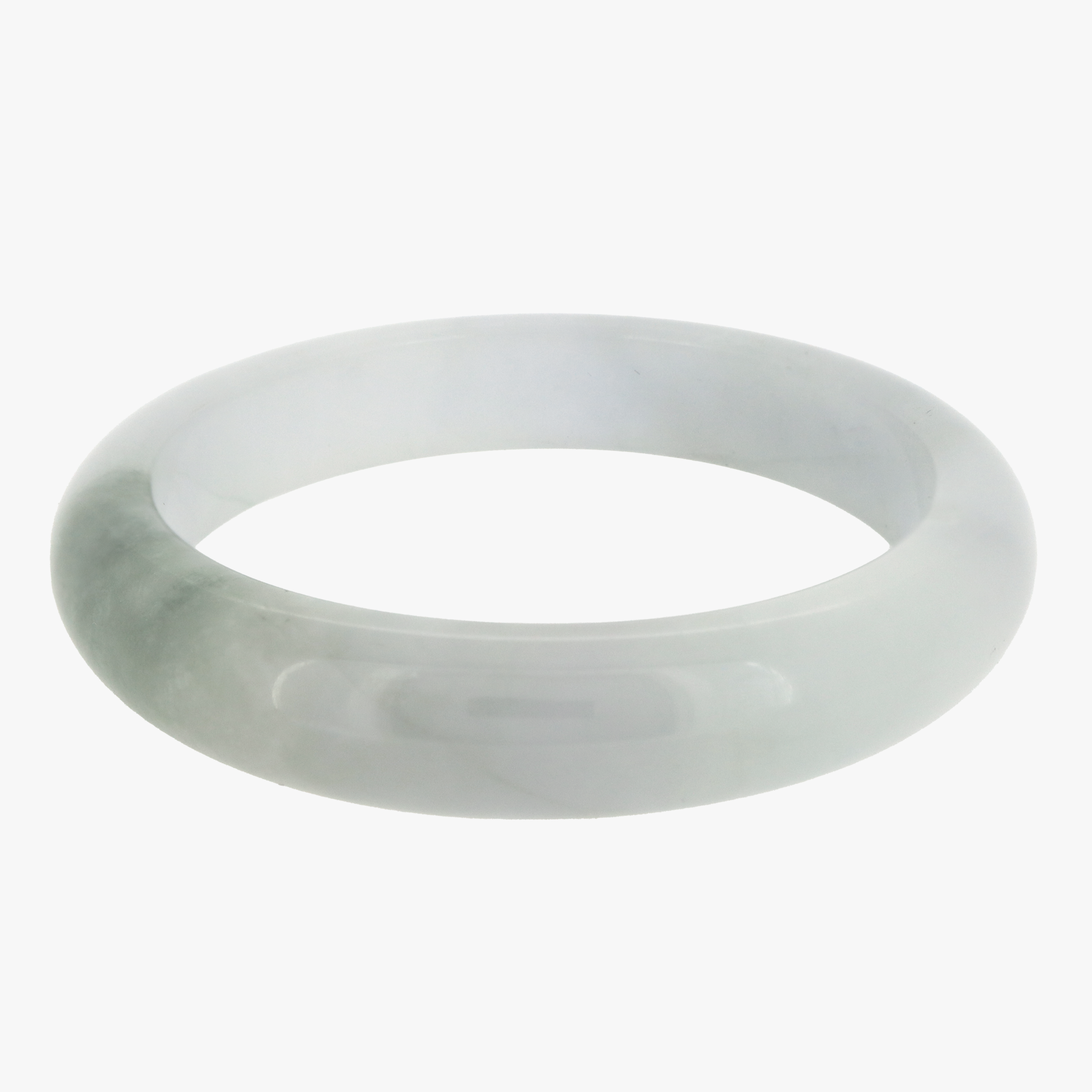 From our Grade A jade series featuring high quality, untreated natural Burmese Jade comes our Ika Jade Bangle. The bangle is a plain white-ish green bangle with a unique desaturated mossy green cloudy spot.