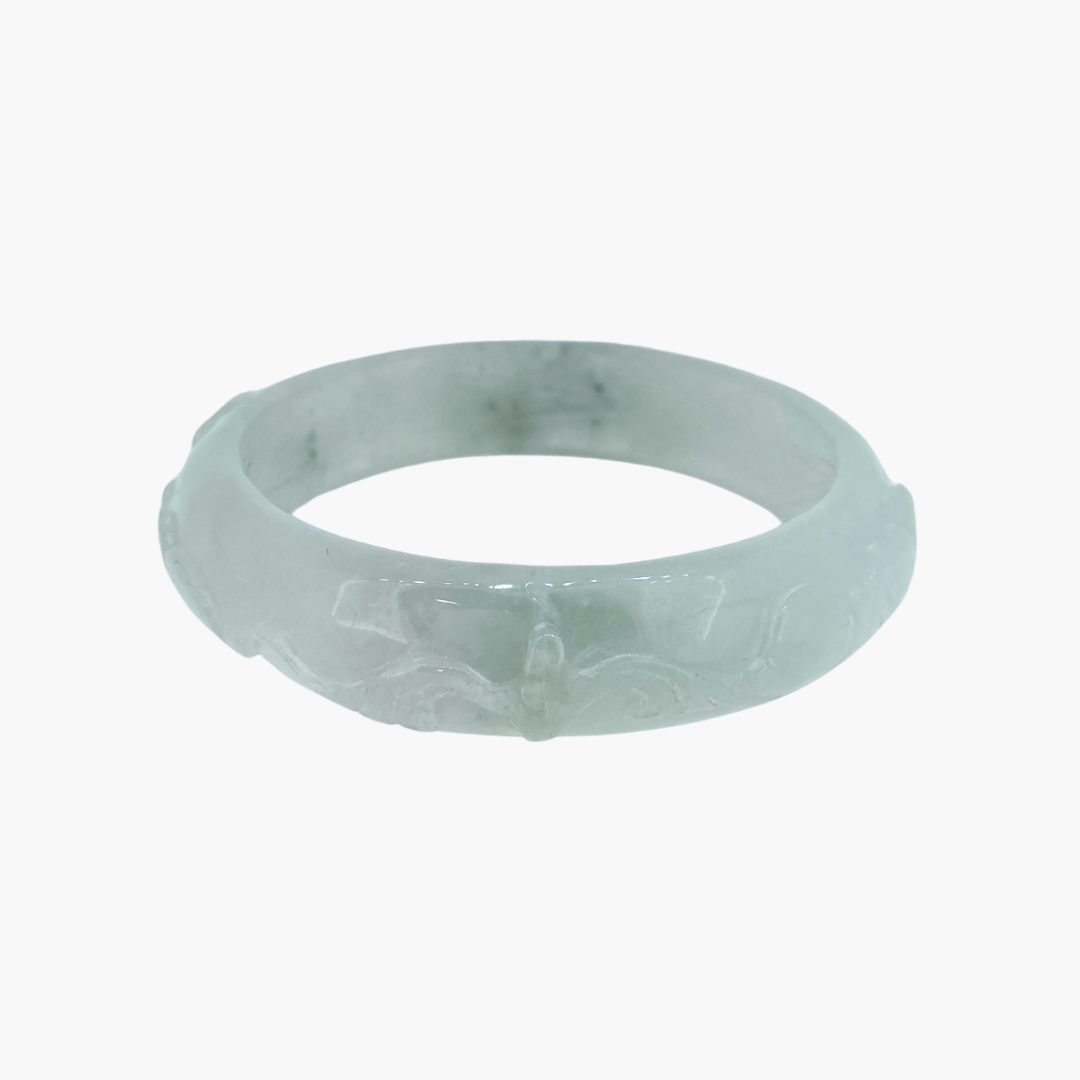 This jade bangle features a pale grey base, delicately carved to showcase fine craftsmanship, with subtle hints of green woven through the stone. The gentle colour shifts add depth while keeping the overall look calm and understated. A beautifully refined piece that blends traditional artistry with soft, natural tones.