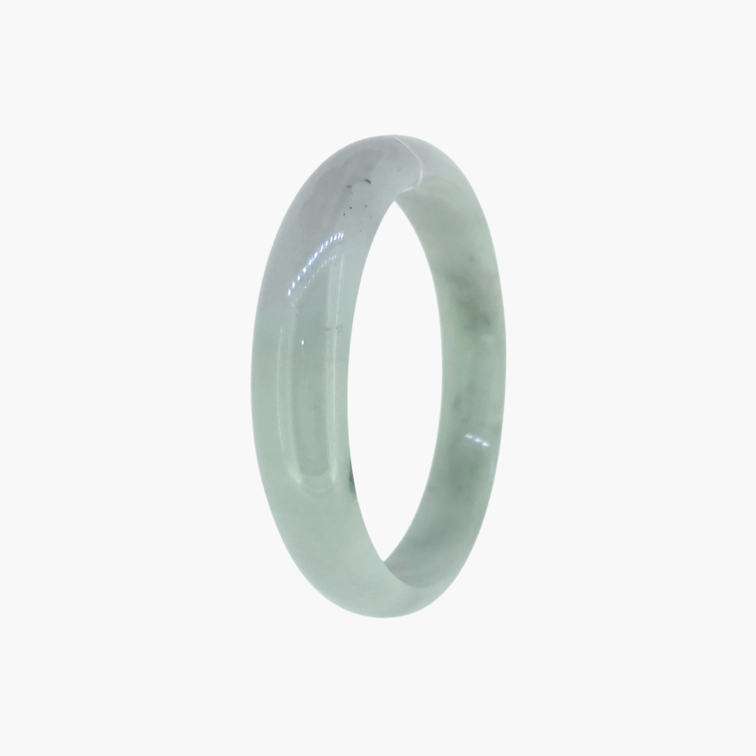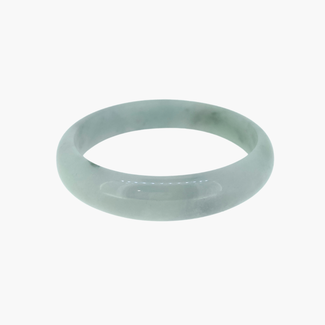 This jade bangle features a soft grey base with a very subtle hint of green, accented by a few natural black inclusions. The muted palette gives the stone a calm, contemporary feel, while the dark markings add character and individuality. Smoothly polished and naturally unique, it’s a quietly striking bangle with modern elegance.