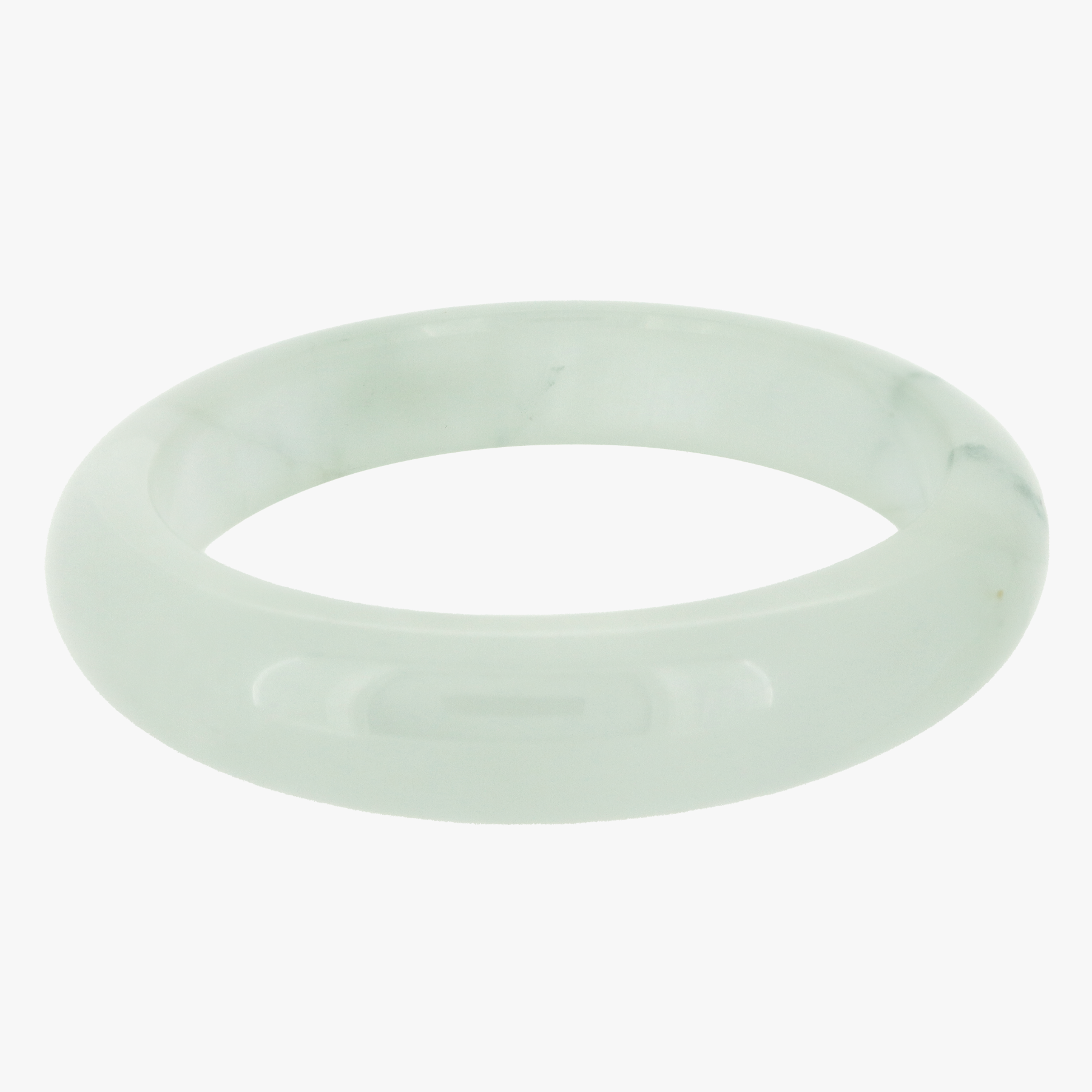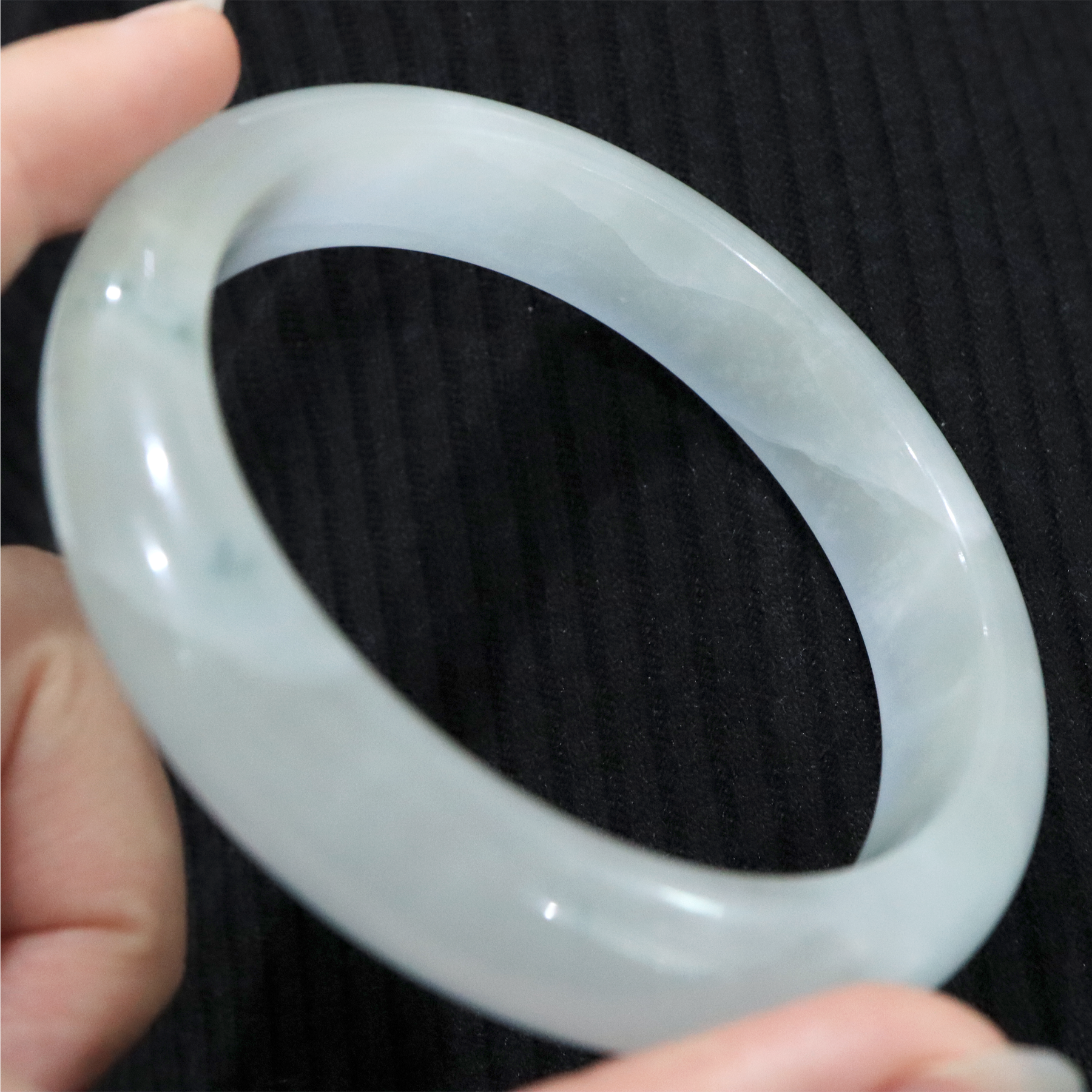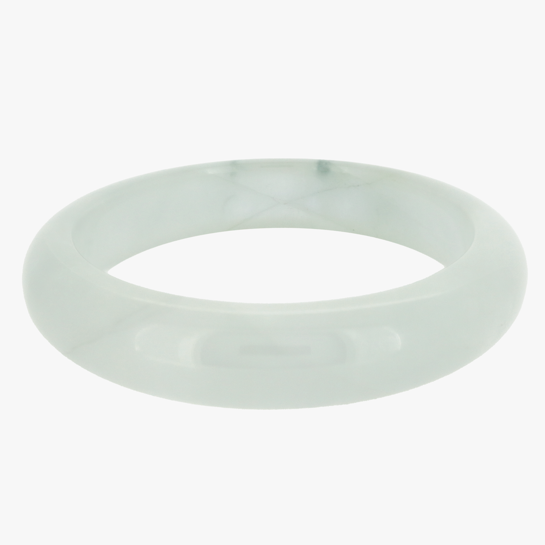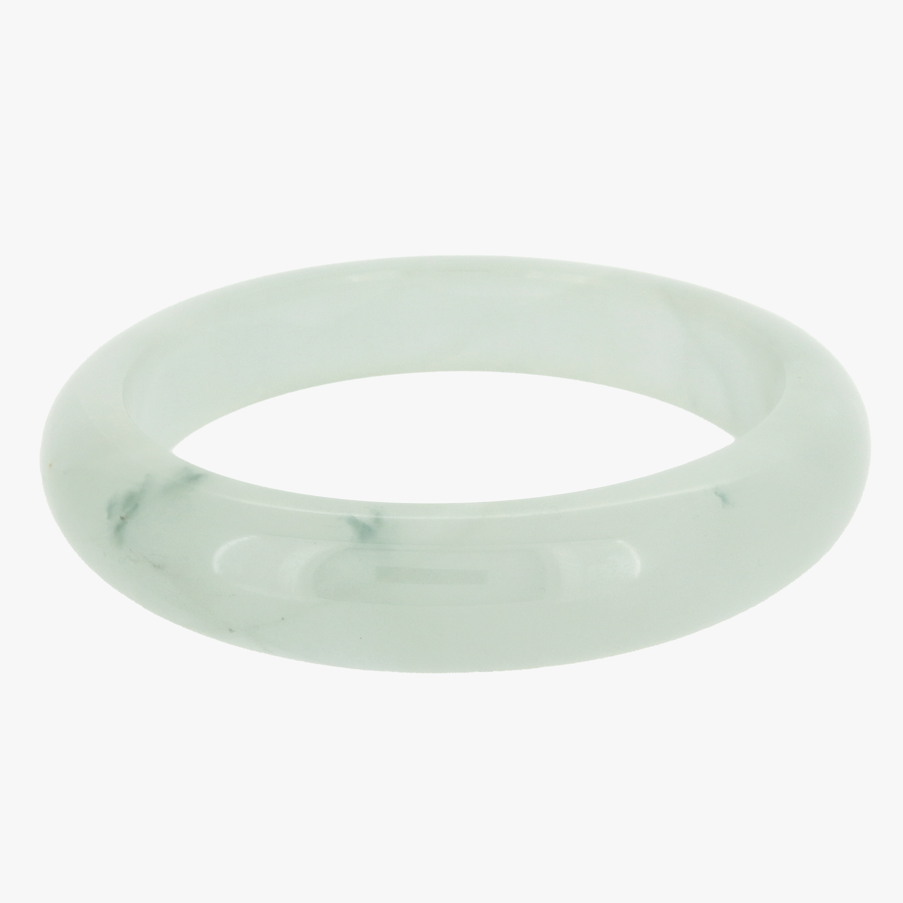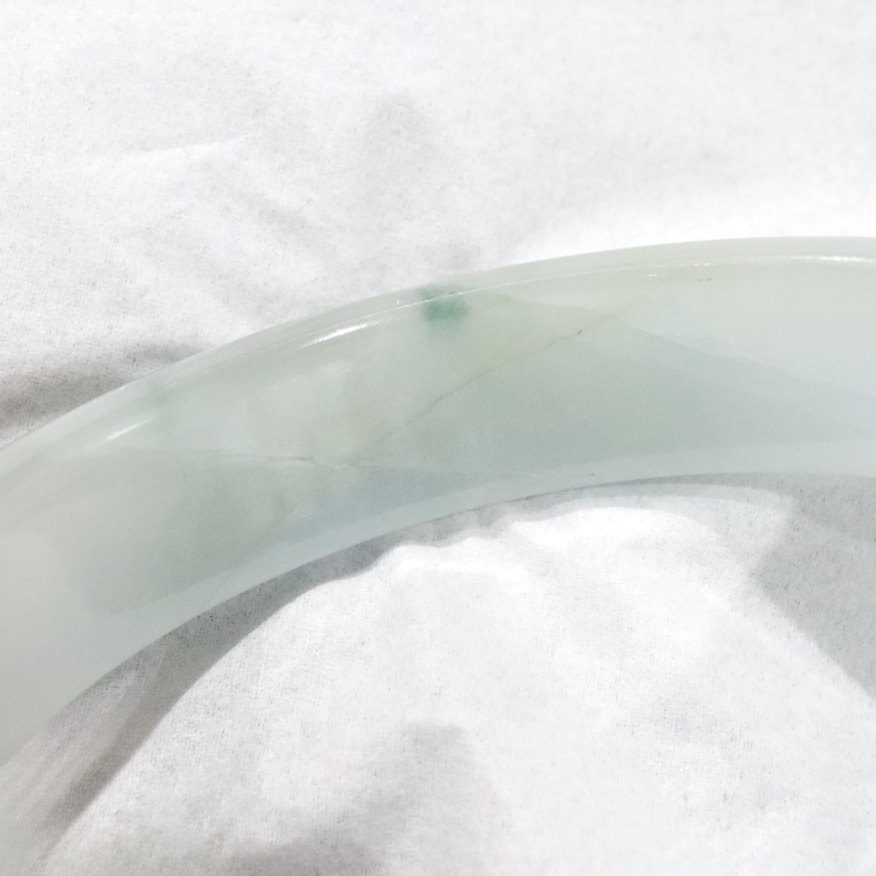 From our Grade A jade series featuring high quality, untreated natural Burmese Jade comes our Suimu Jade Bangle. The bangle is a translucent light bluish-grey colour with small flecks of green and multiple visible cracks.