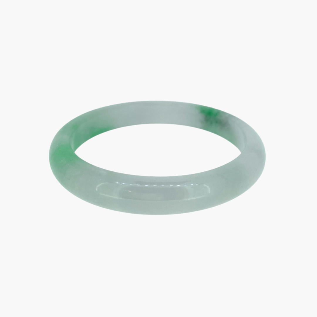 This jade bangle features a soft white base threaded with gentle green streaks that flow naturally through the stone. The subtle lines add movement and depth while keeping the overall look light and refined. Smoothly polished and naturally unique, it’s a timeless piece that showcases the quiet beauty of jade.