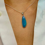 This Australian doublet Opal pendant is crafted in Sterling silver featuring a sleek opal piece in an mesmerising aqua colour with green accents. This unique combination of colours is sure to make a statement. Perfect for any special occasion.