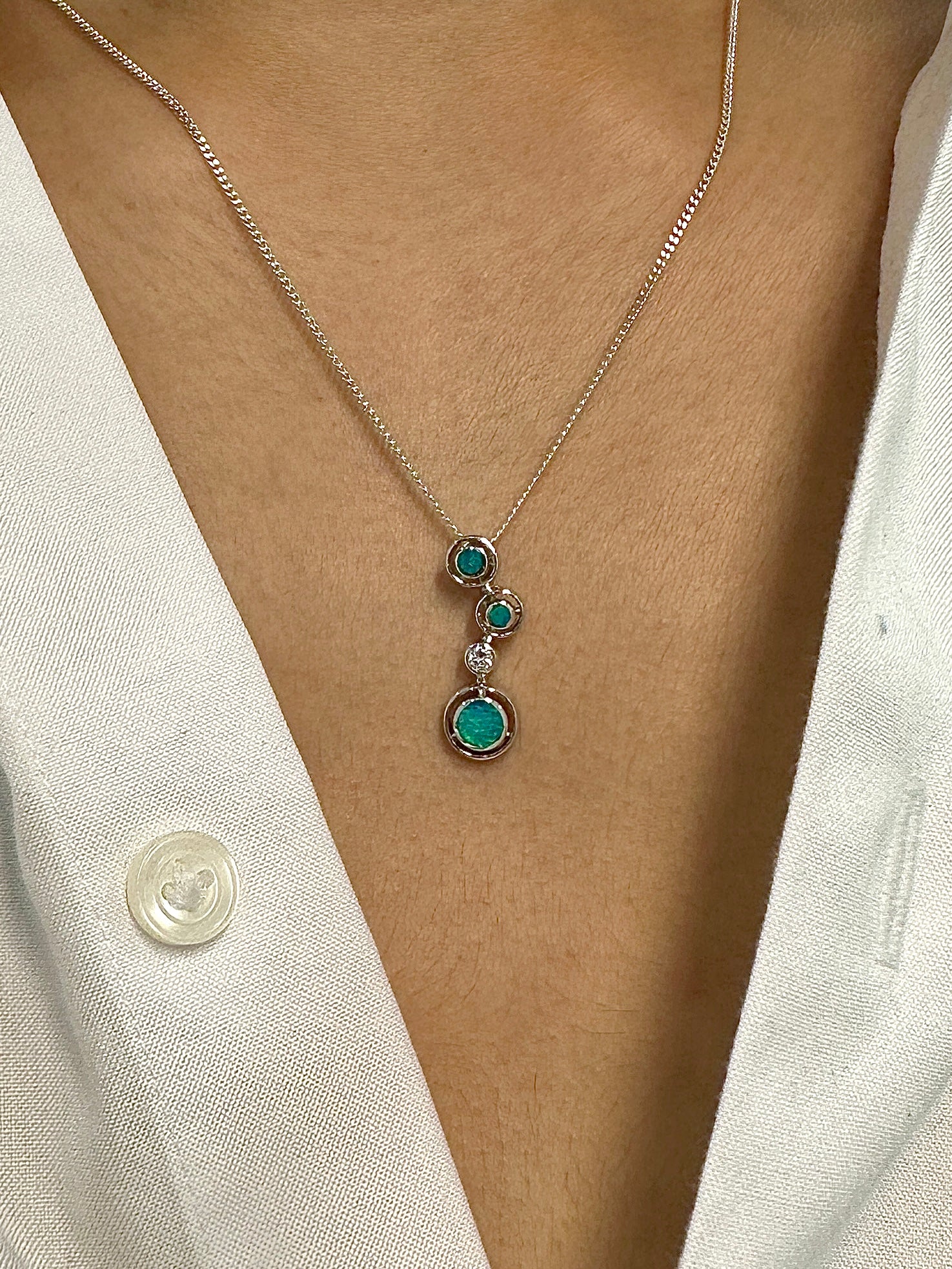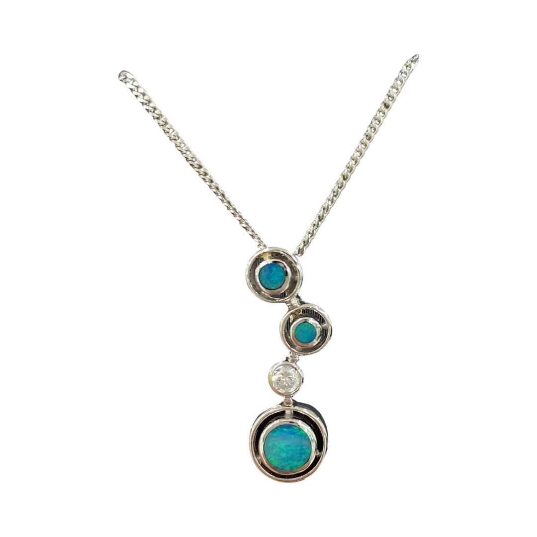 Behold the captivating beauty of the Amelia pendant. Crafted with a precious blend of sterling silver, three dazzling Australian doublet opals and a cz stone, this pendant makes a timeless, luxurious statement. An eye-catching design featuring bold creativity and craftsmanship, it's the perfect piece for the modern trendsetter and the stylish sophisticate alike.