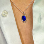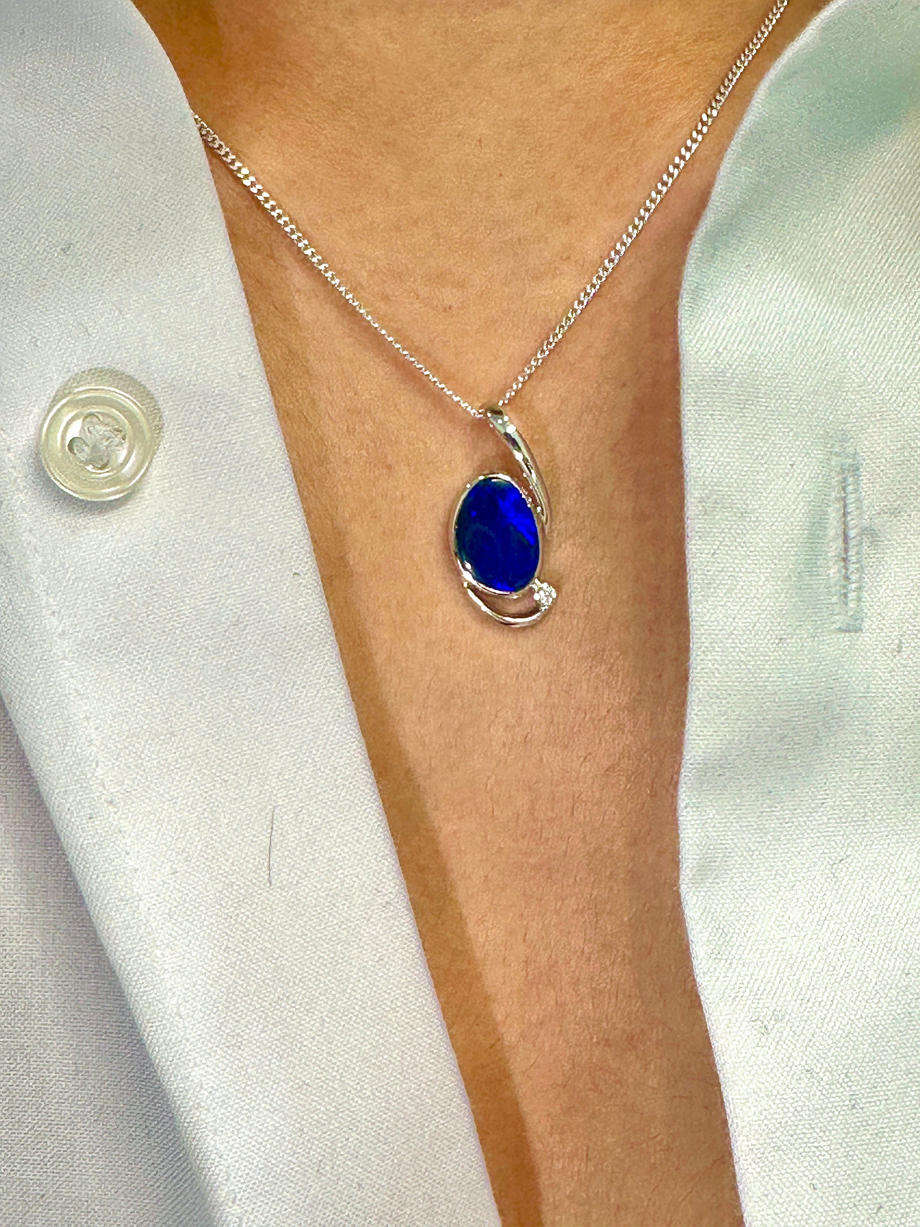 This stunning pendant features an Australian doublet Opal with a deep blue hue set in Sterling silver. A small cz adds a subtle sparkle at the end. Contemporary and eye-catching, this pendant will make the perfect addition to any look.