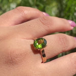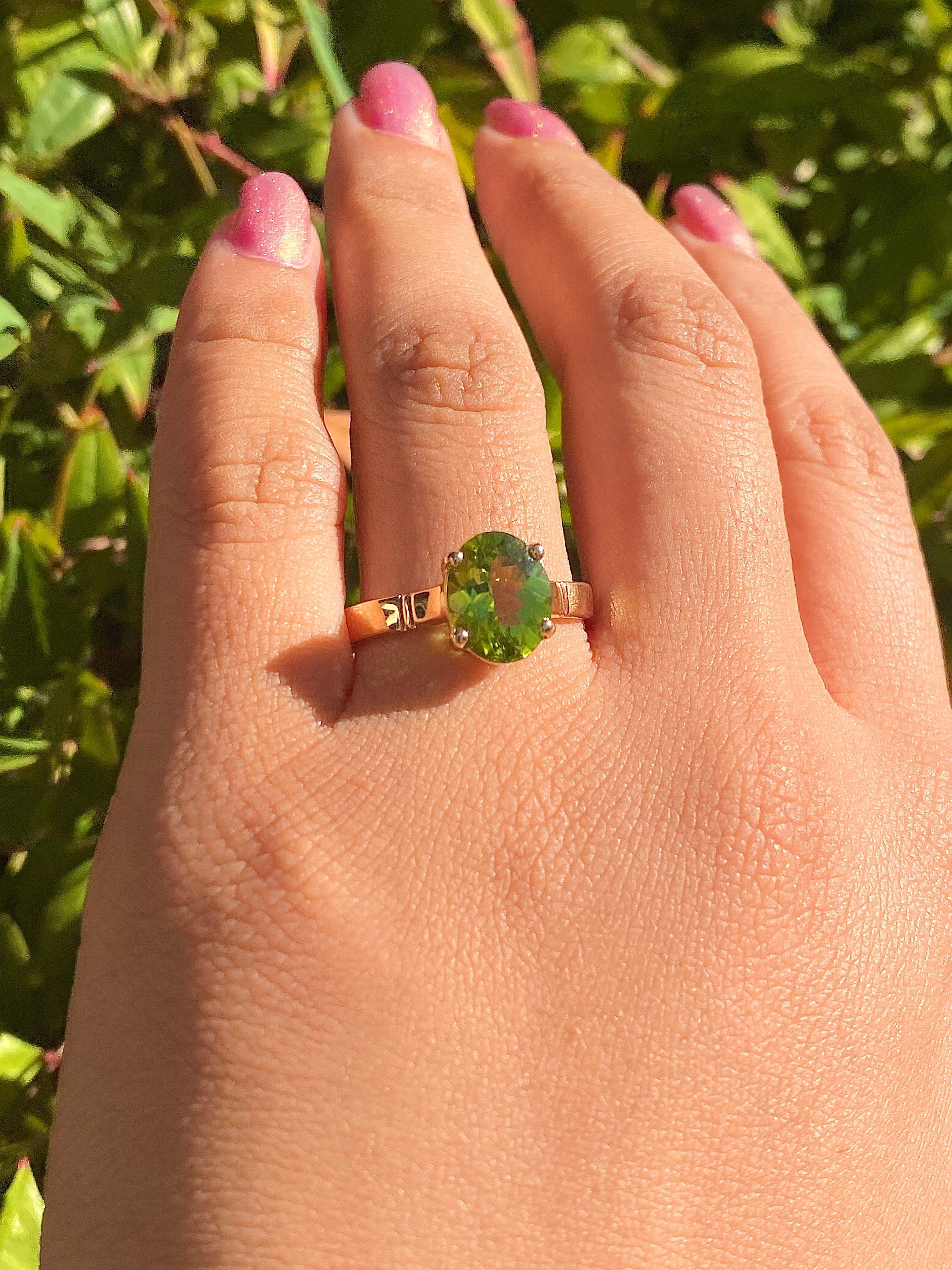 Make a timeless impression with this exquisitely-crafted Thalia ring, fashioned from 9ct yellow gold and featuring a captivating peridot gemstone. Enjoy the luxuriant blend of modern class with traditional elegance that this statement piece brings to your ensemble.
