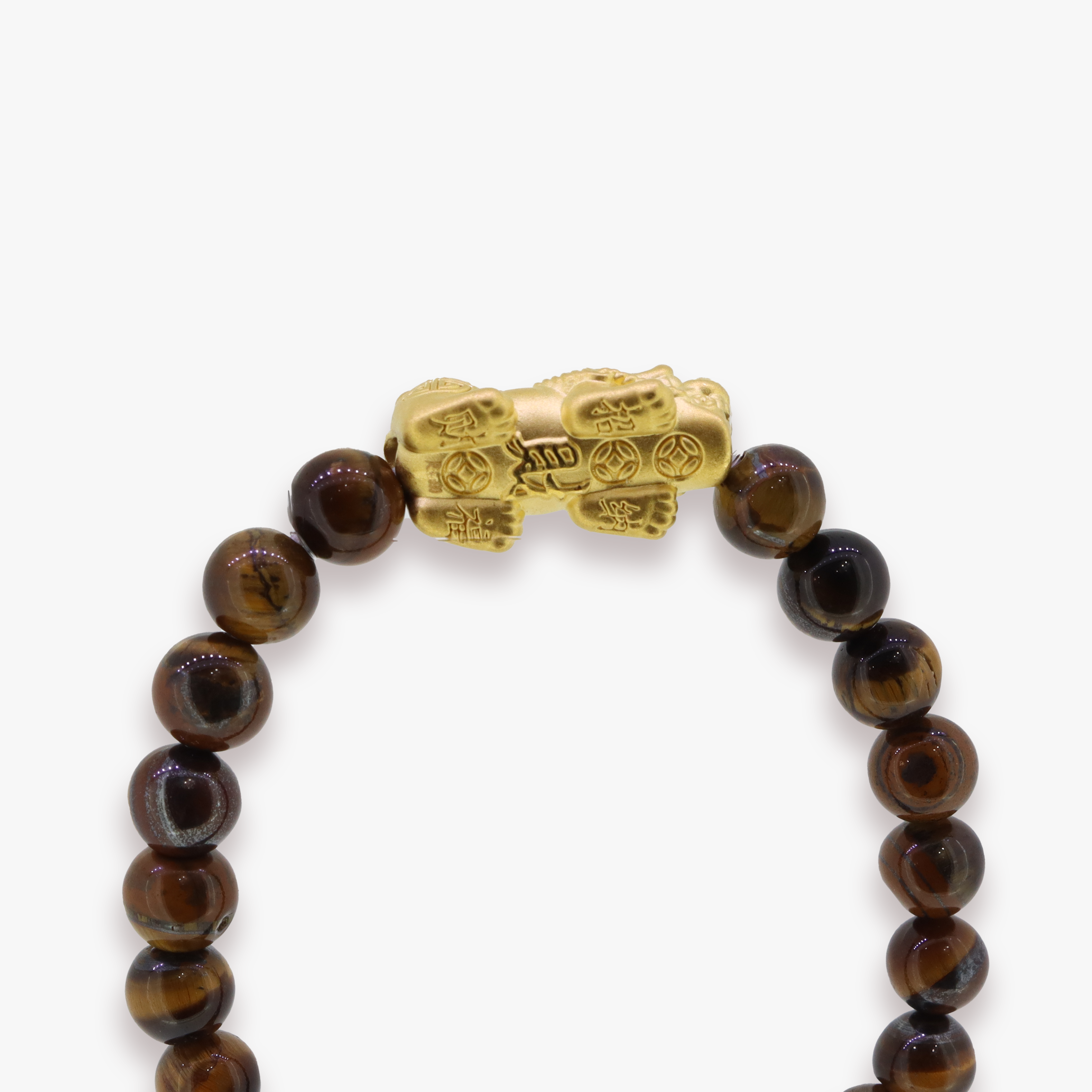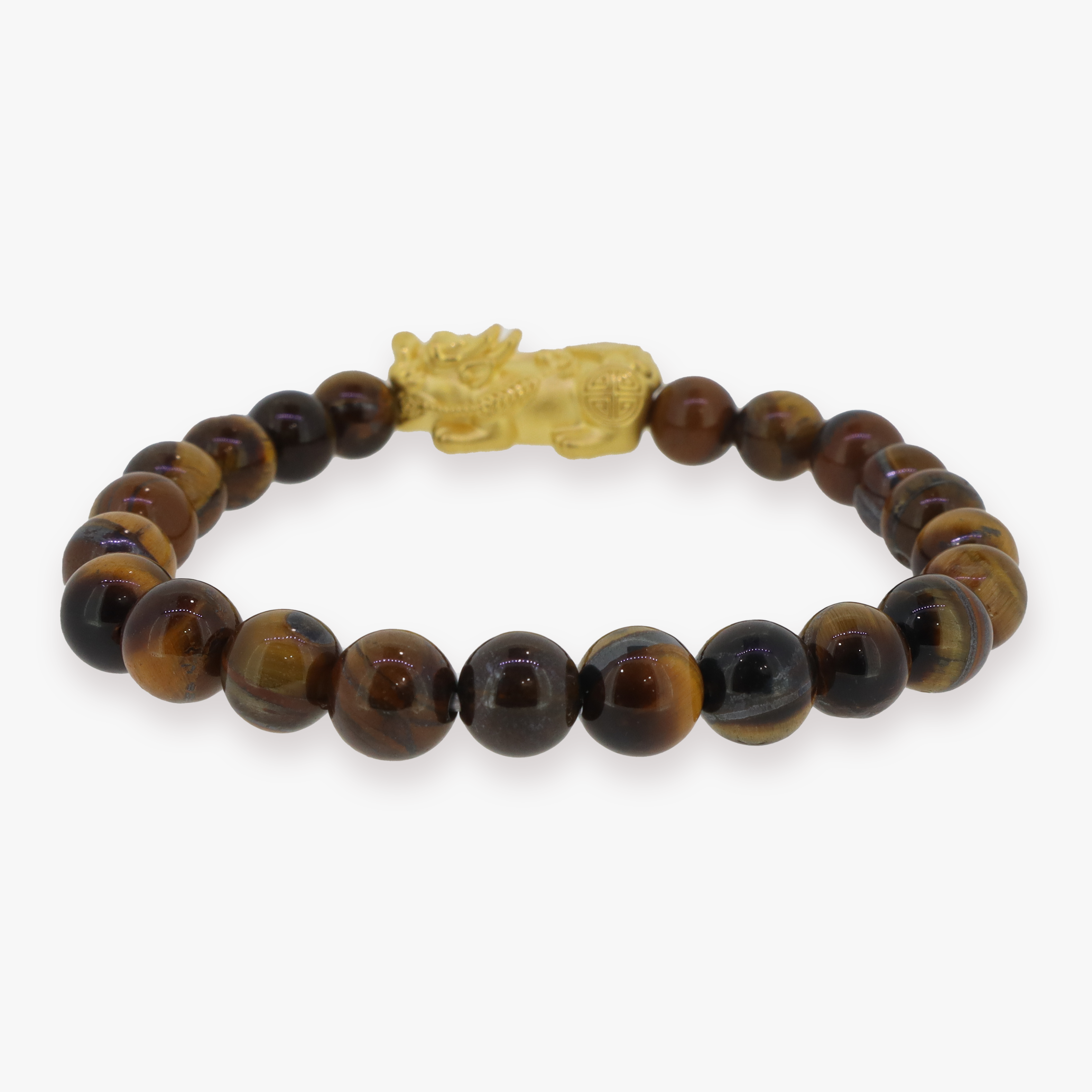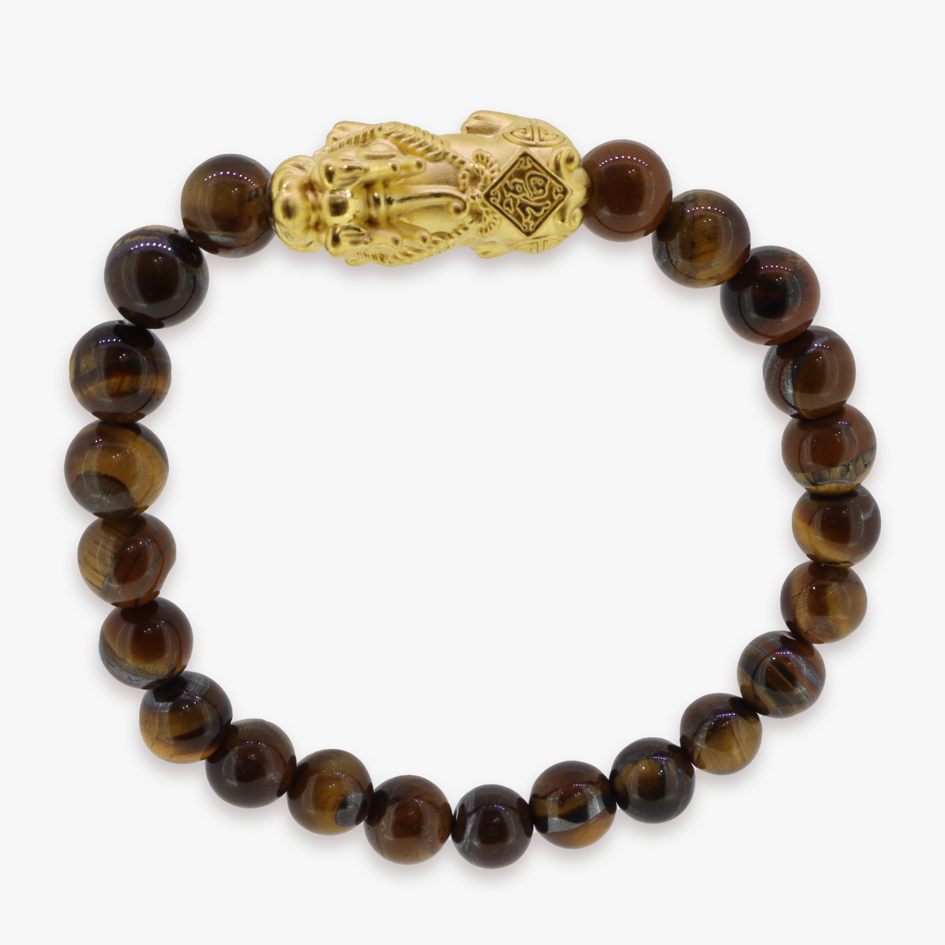 24K Yellow Gold 'Good Luck' Pixiu approximately 25mm x 9 mm in size. Threaded tigereye bracelet 60mm diameter, 8.2mm diameter beads.