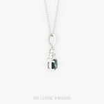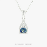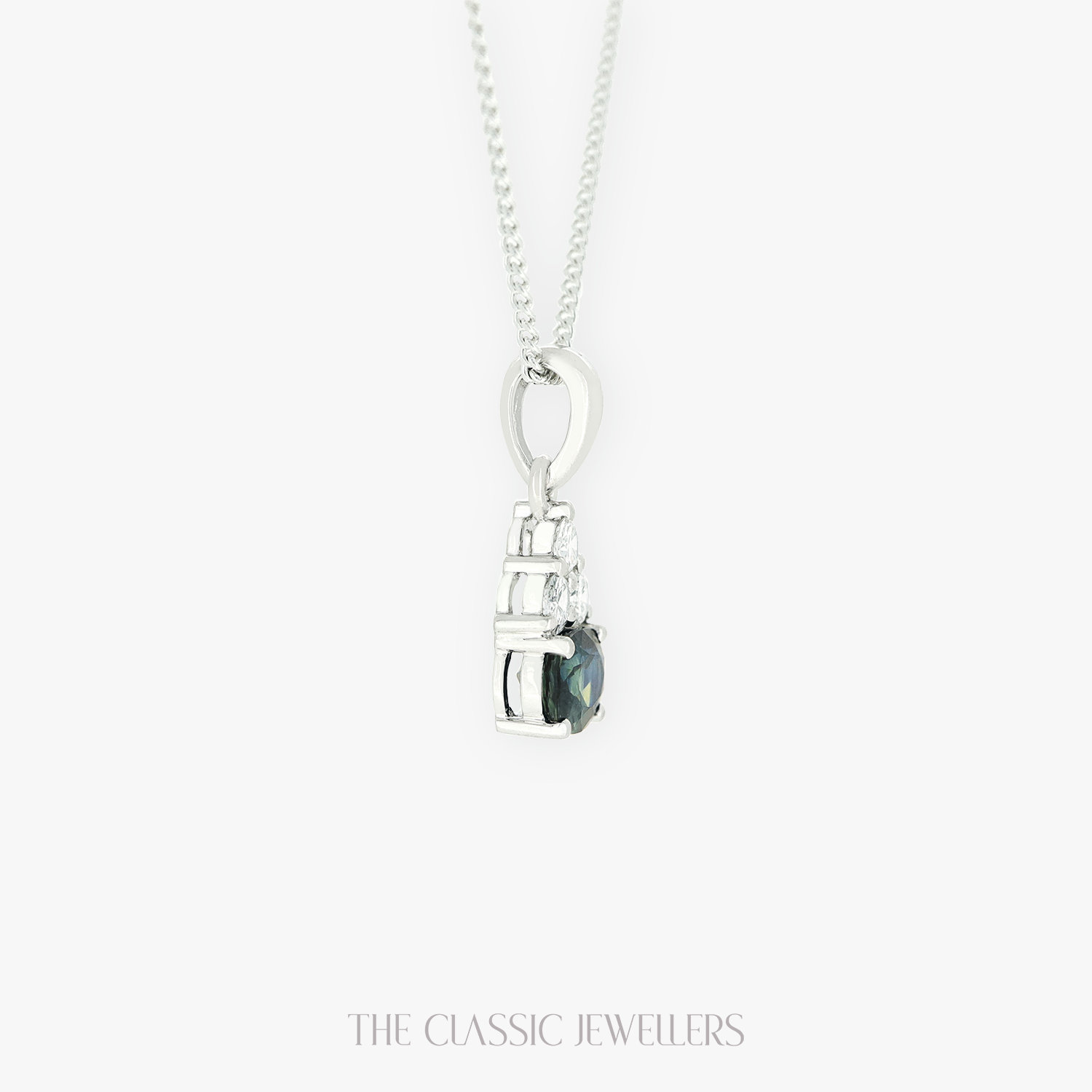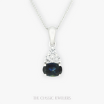Made with 18K White Gold, our Cloud Pendant features a beautiful oval cut natural blue parti sapphire, accented by three round natural diamonds stacked on top. Chain is not included.