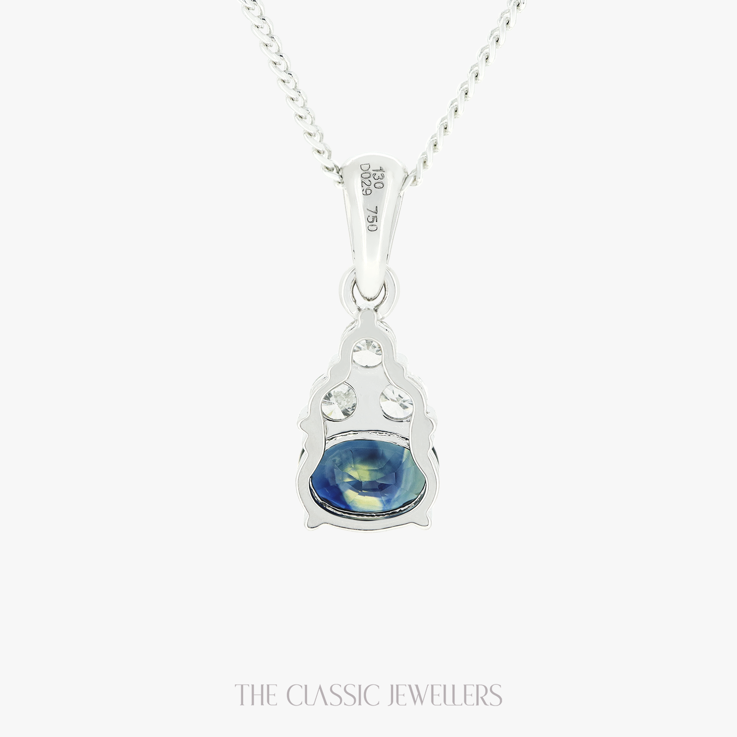 • Stone - 1.29ct Oval Cut Natural Parti Sapphire, 3 Brilliant Round Natural Diamonds 0.30pt - G/H Colour, SI Clarity.
