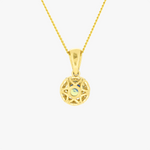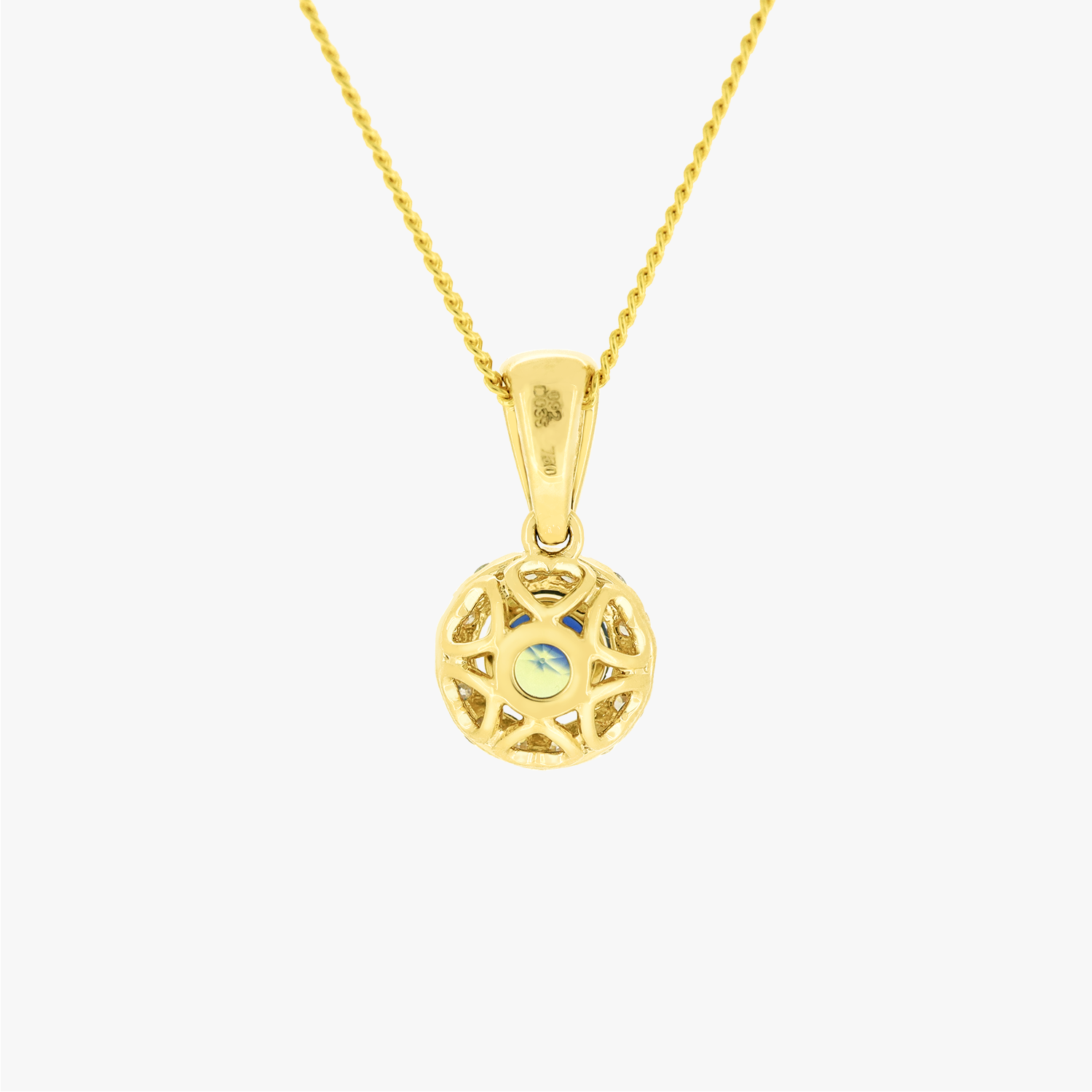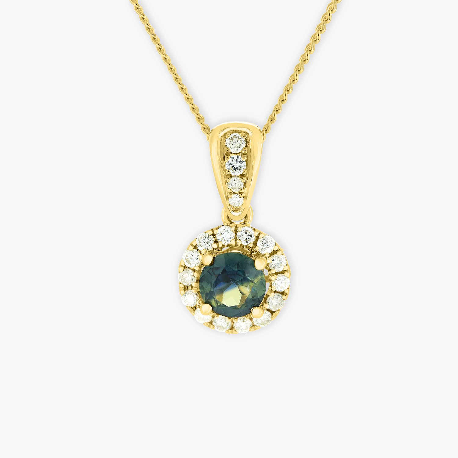 Crafted with 18K Yellow Gold, our Kilby Pendant features a beautifully cut round natural parti sapphire, accented by round natural diamonds held in an intricate star heart setting. Chain is not included.