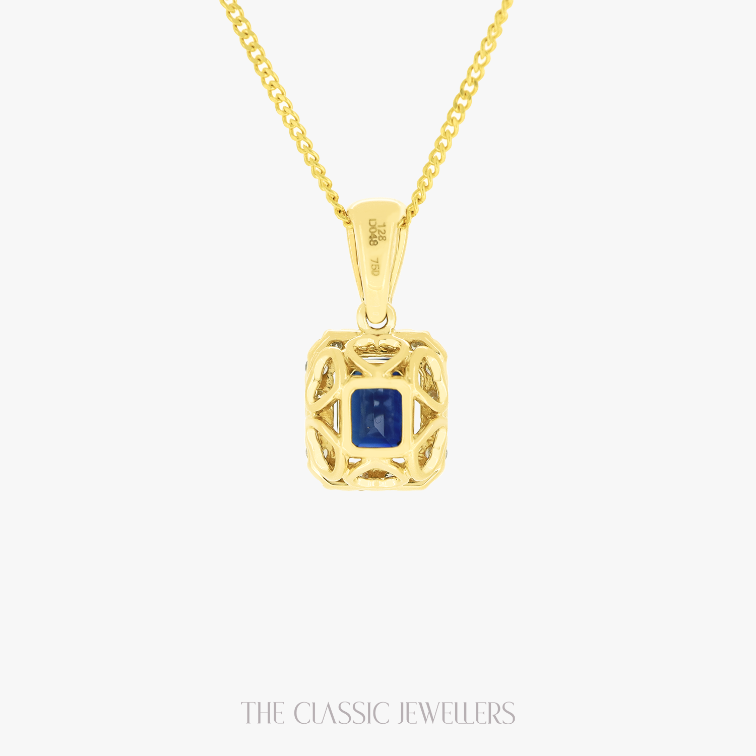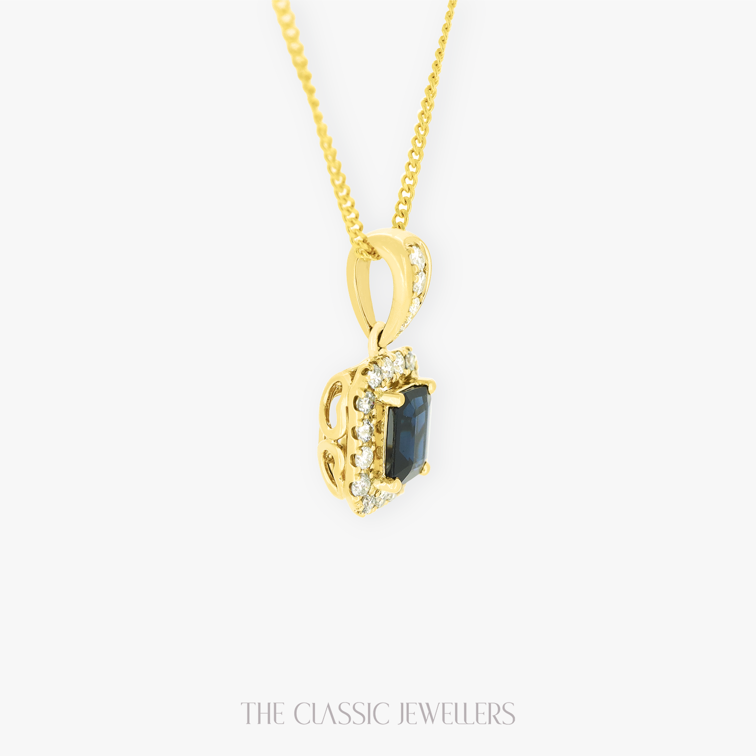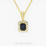 Made with 18K Yellow Gold, our Pea Pendant features a beautiful emerald cut natural deep blue parti sapphire, accented by twenty round natural diamonds around the sapphire and bail. Chain is not included.