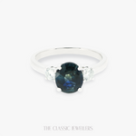 Cast in 18K White Gold, our Birdie ring features a beautiful round cut natural deep blue green parti sapphire, accented by two round natural diamonds on either side.