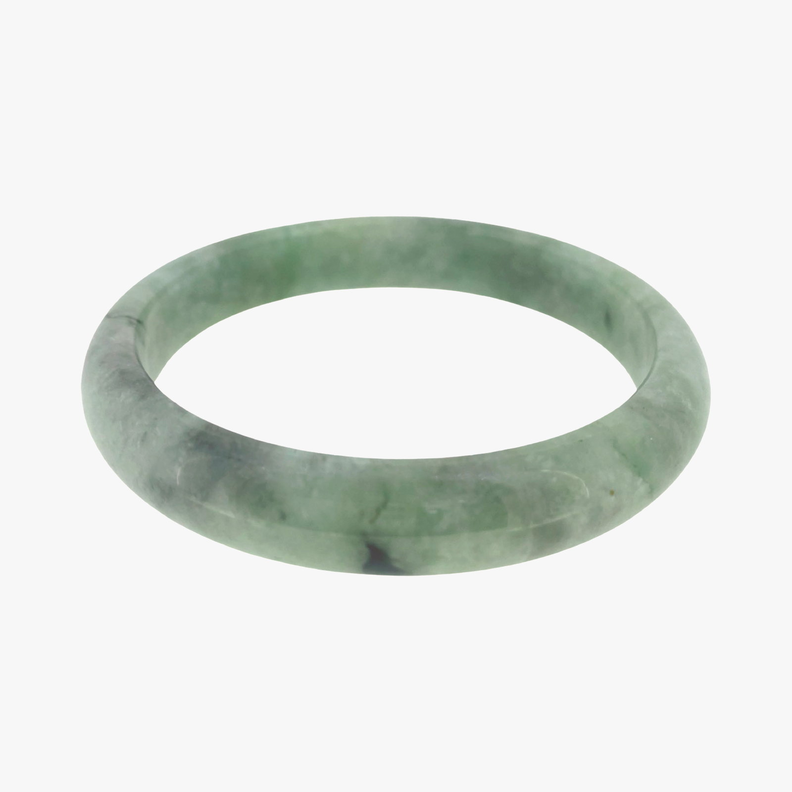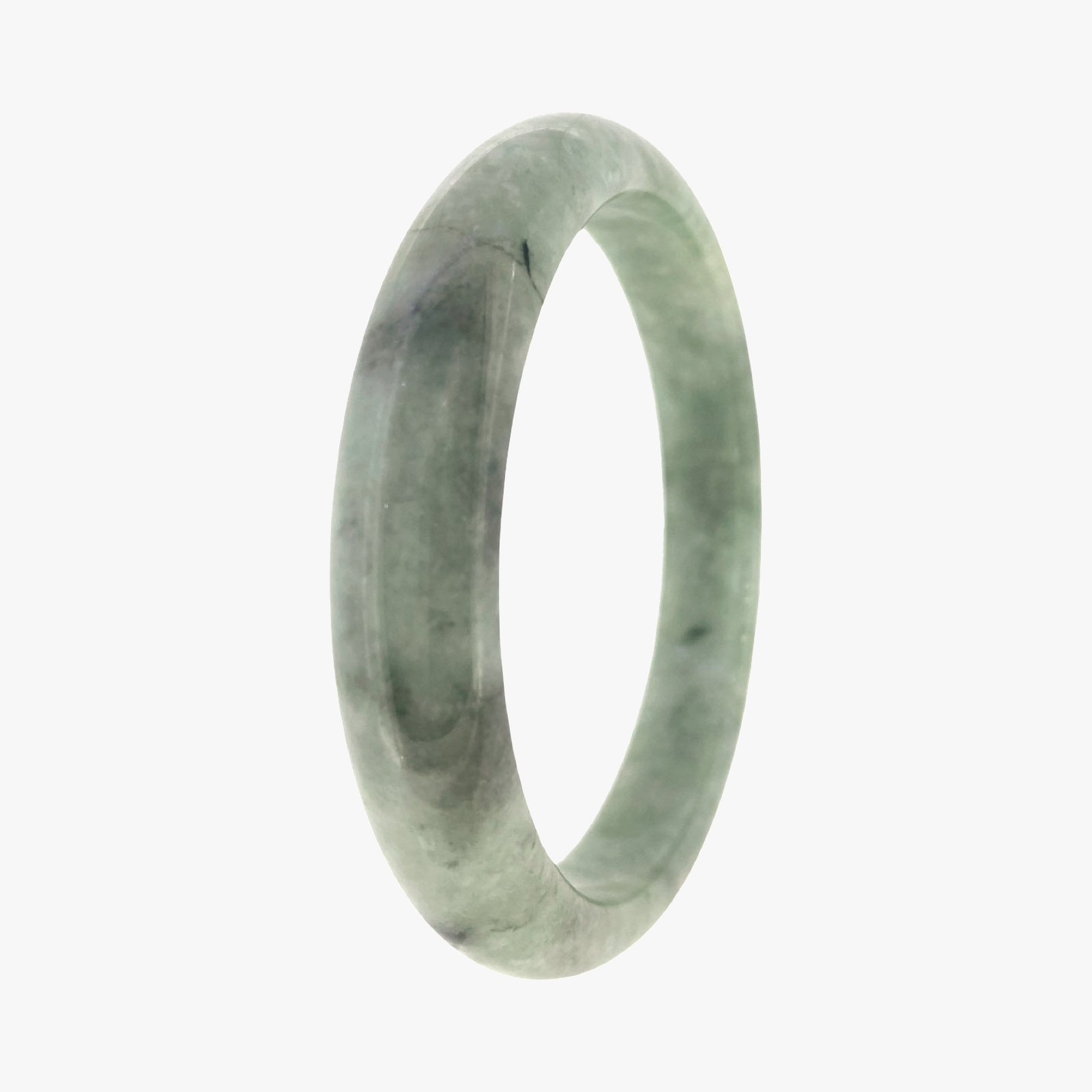 This light green Burmese jade bangle features some hazy grey clouds amongst the band. The colouring and pattern is reminiscent of the lichen that grows on trees. The bangle can be worn as a decorative accessory or as a symbol of good luck and prosperity, and on special occasions or as everyday jewellery.