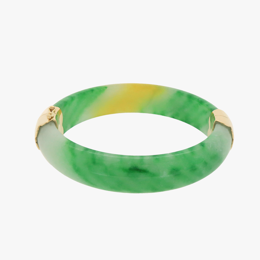 From our jade bangle collection, we have bangles that feature a strong 9K Yellow Gold magnetic clasp with a hinge mechanism that is perfect if you struggle to put on jade bangles. Made of Burmese Jade, this bangle features a beautiful mix of white, strands of light greens and yellow.