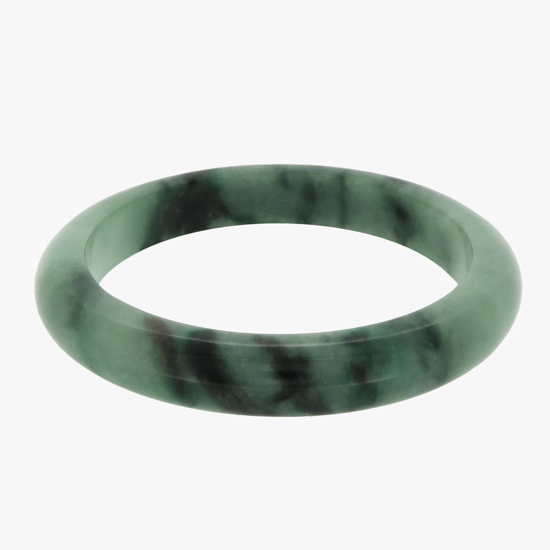 From our Grade A jade series featuring high quality, untreated natural Burmese Jade comes our Pilly Jade Bangle. The dark grey stripes in this smaller, saturated green half-round jade bangle creates a unique look that separates this piece from the rest.